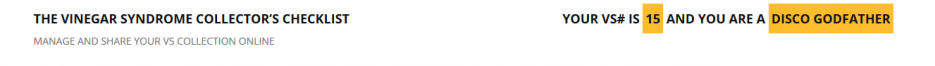 Collecting Blu-rays has turned from a hobby into an obsession for some people, and that means trying to find all of the releases from particular labels. Vinegar Syndrome recognizes that, and they’ve come up with a solution to make sure fans can log all of their Vinegar Syndrome-released Blu-rays and DVDs. The Vinegar Syndrome website now contains a checklist of all of their past and present releases in a simple format that allows the user to input everything they own and then get a rank that corresponds to movies they’ve released. For example, my (pitiful) score is: