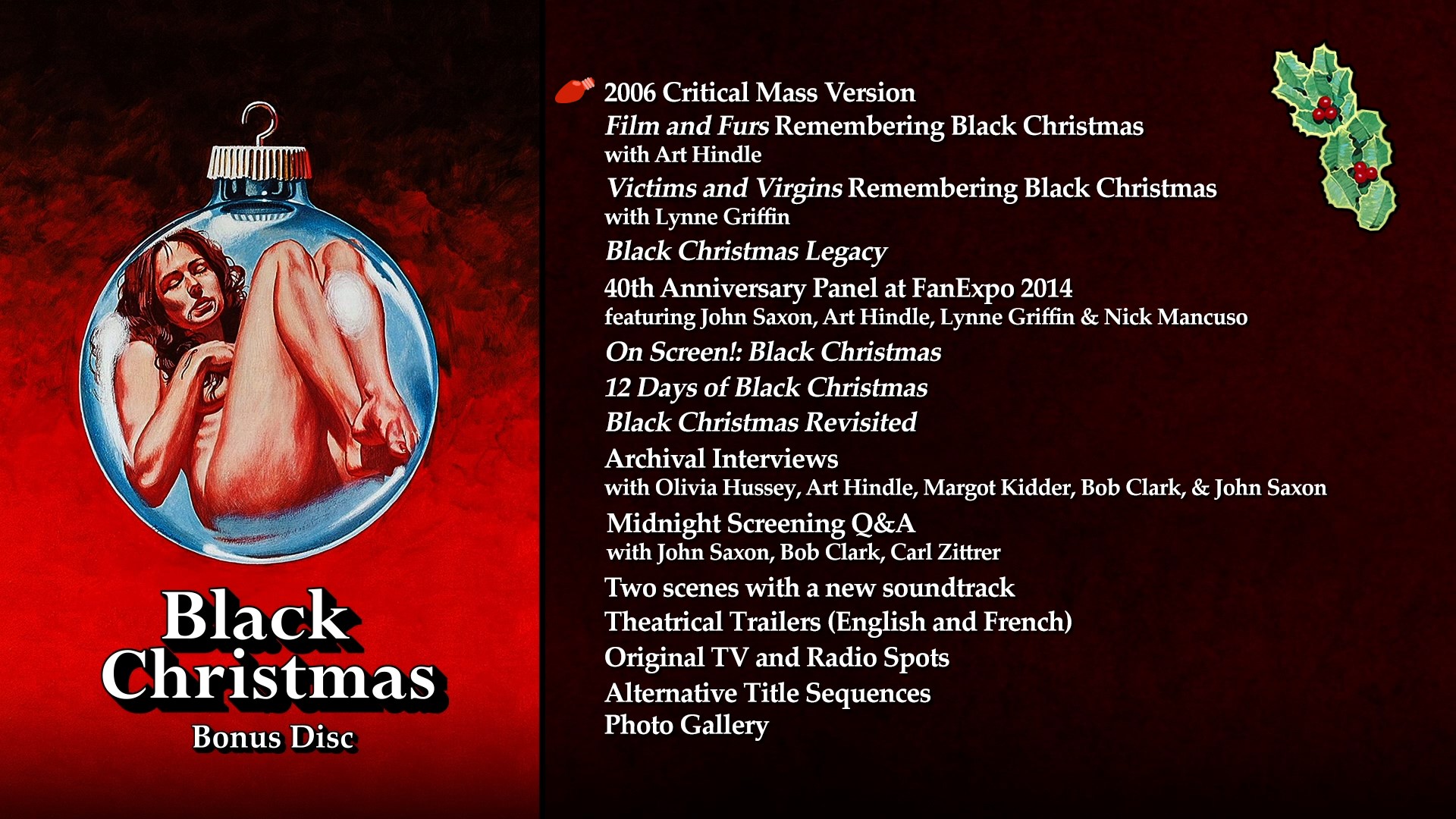 - Archival Interviews With Olivia Hussey, Art Hindle, Margot Kidder, Bob Clark, & John Saxon (1080p; 1:41:30)