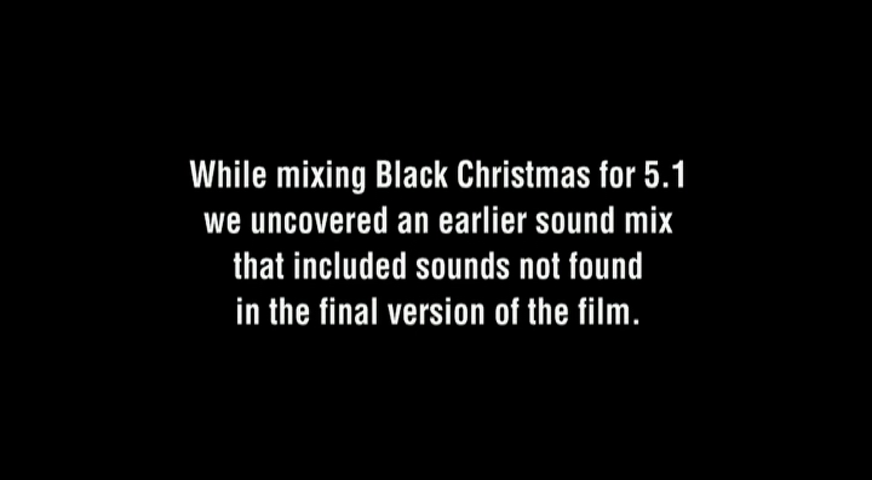 - NEW Black Christmas: Restoring The Sound – Brett Cameron Discusses The Hundreds Of Hours Put Into The Restoration Of The Film’s Audio Track For This Release (1080p; 8:05)