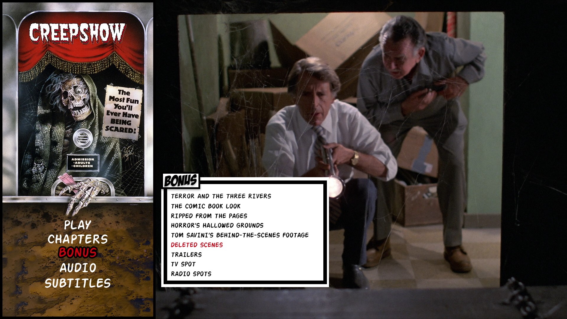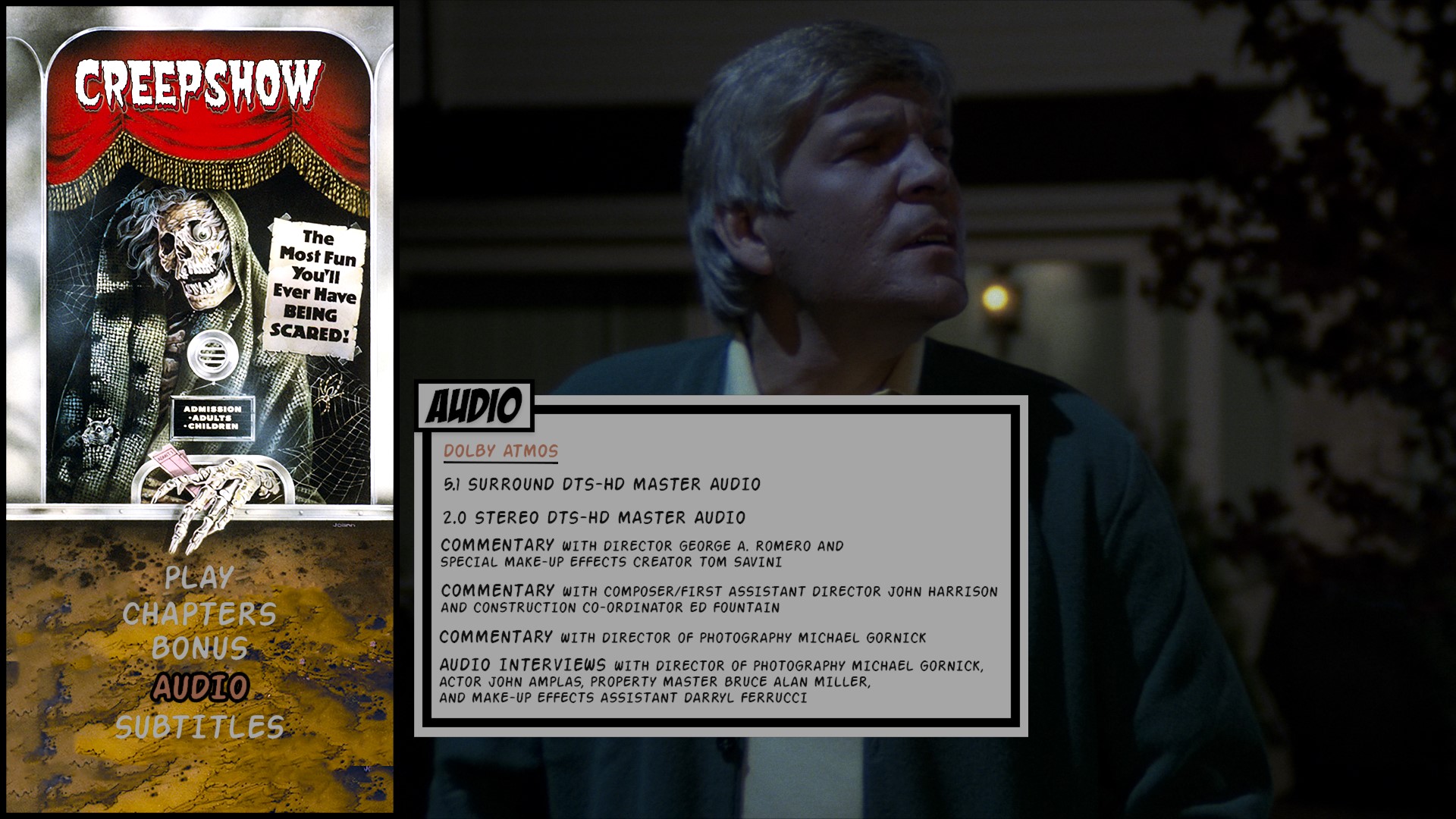 - Terror And The Three Rivers – A Round Table Discussion On The Making Of Creepshow With John Amplas, Tom Atkins, Tom Savini, And Marty Schiff (1080p; 30:10)