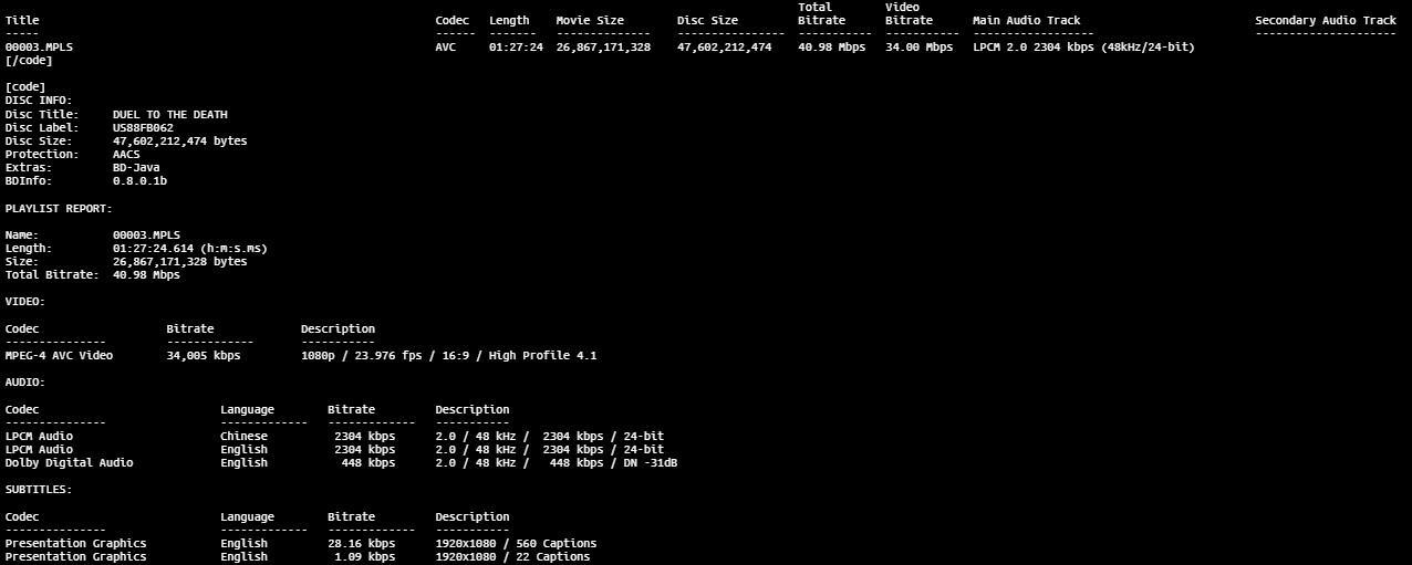 Duel to the Death BD info