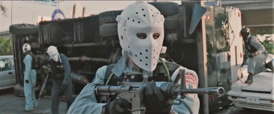 Heat utilizes the hockey mask exactly like you’d expect – during the heist, it’s a face covering so that no one knows who they fucking are and they don’t get arrested. Seems pretty obvious.