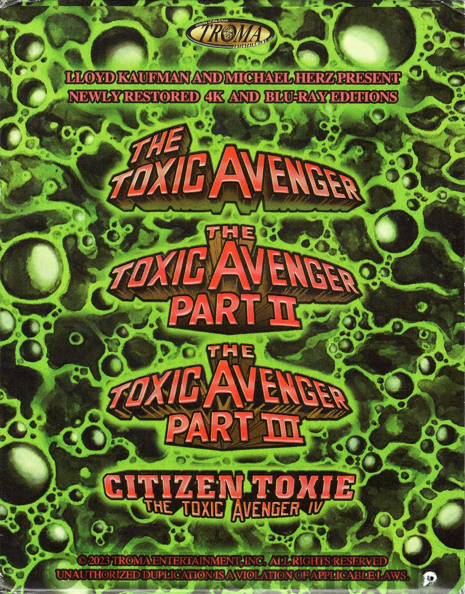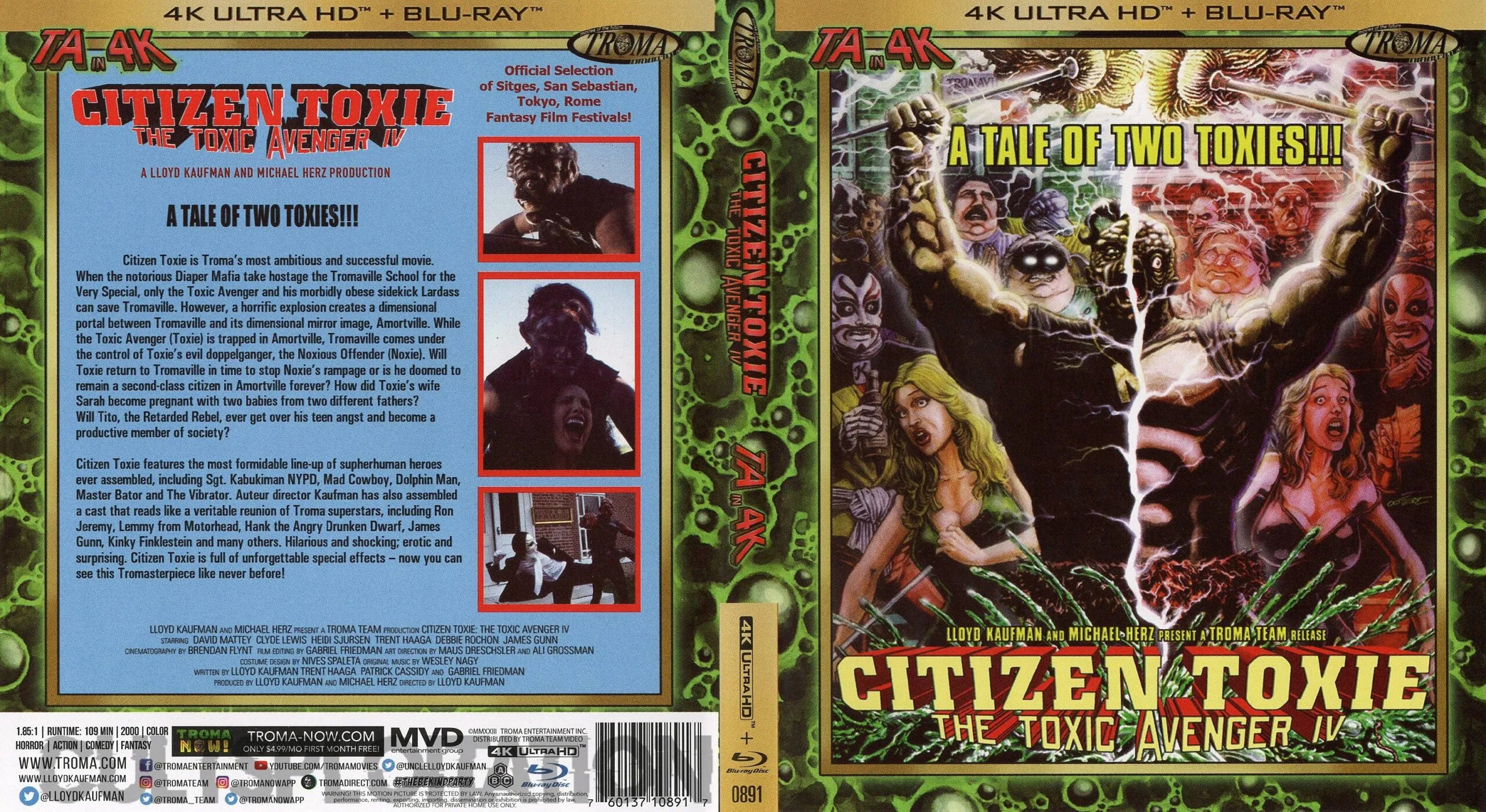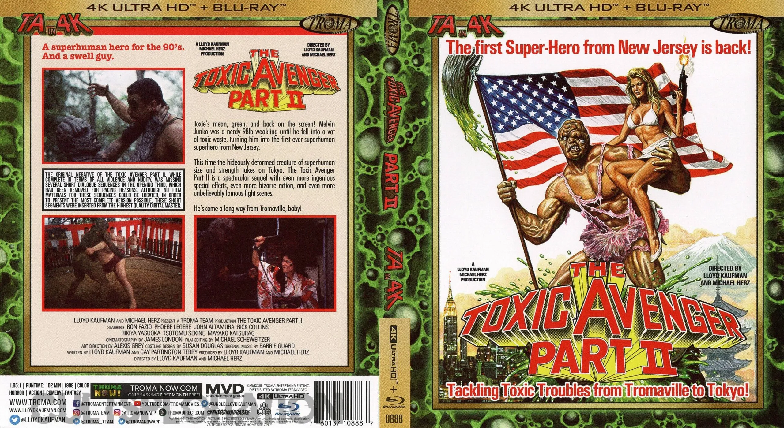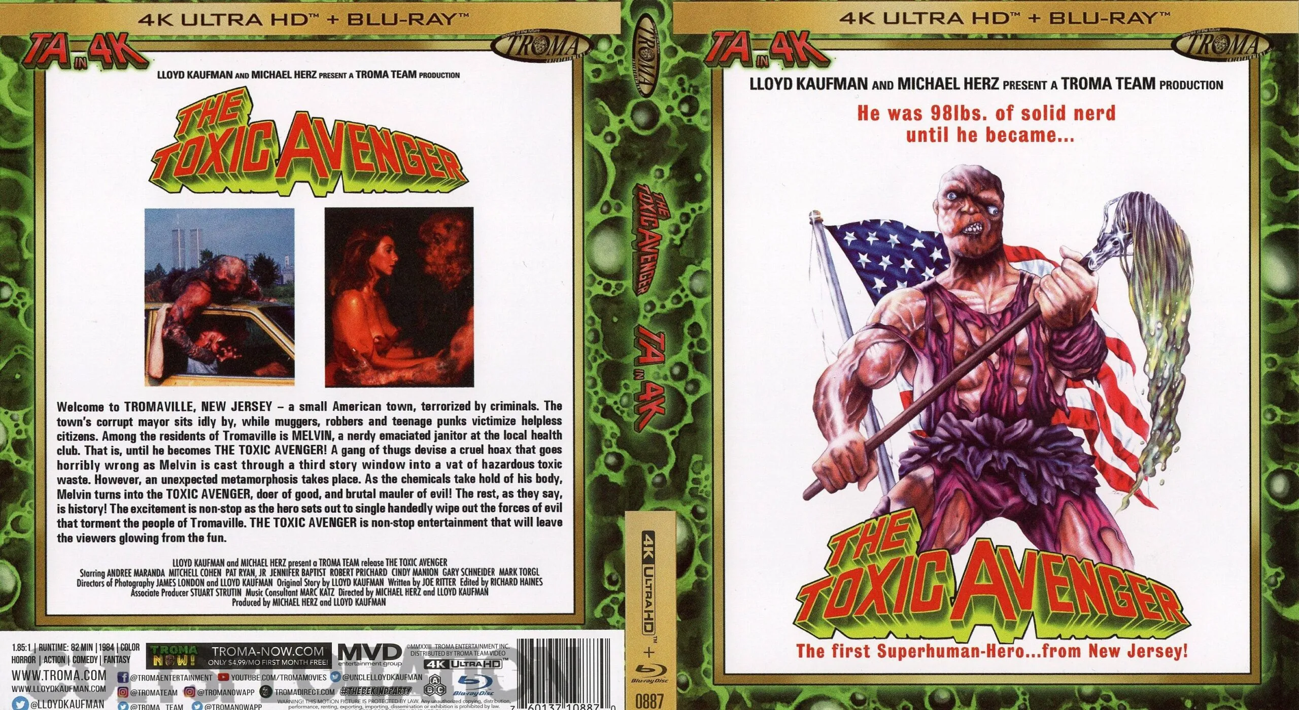 For the first time in the history of mankind, all four Toxic Avenger films of the world famous franchise have been brought together into one Tromarific 4K Ultra HD + Blu-ray package! This “TOXSET” (which you could hold in your hands if you hand over your money to buy these again) will prove to be an increasingly valuable collectible. Because Lloyd Kaufman, Toxie’s creator, is over 70 years old, he could die at any time. This will make this limited edition soar in value!