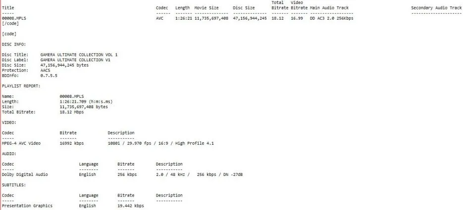 Click for a larger image and a slideshow.ScreencapsMenusBD InfoGamera vs. Gyaos BD infoGamera vs. Gyaos Bitrate ViewerGamera vs. Gyaos Dolby Digital 2.0 SpekPackaging DetailsSee collection galleries for the packaging.Hosting screenshots is expensive. If you want to see more galleries, consider donating!