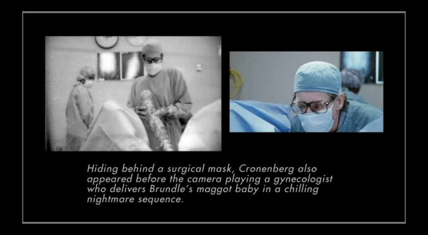 - Test Footage (Main Titles, Lighting And Makeup Effects) (SD; Opening Title Treatments: 1:52; Pod Lighting and Effects: 2:02; Brundlefly Makeup: 2:13; Exploding Space Bug: 0:50; Cronenfly: 0:52)