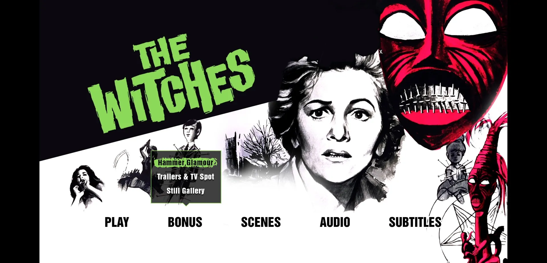 The Witches Cap 1 The Witches Cap 2 The Witches Cap 3 The Witches Cap 4 The Witches Cap 5 The Witches Cap 6 The Witches Cap 7 The Witches Cap 8 The Witches Menu The Witches Bonus Features The Witches Audio Menu Hammer Glamour 01 Hammer Glamour 02 Hammer Glamour 03 The Witches Trailer Prehistoric Women – The Devil’s Own Trailers The Witches Gallery