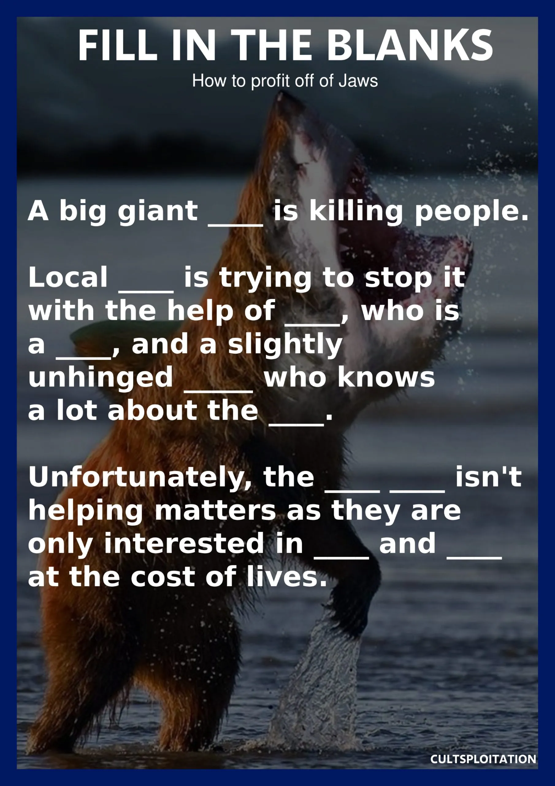 As I’ve mentioned above, Grizzly follows the same sort of structure that Jaws set out a year before. It’s like one of those fill in the blanks game.