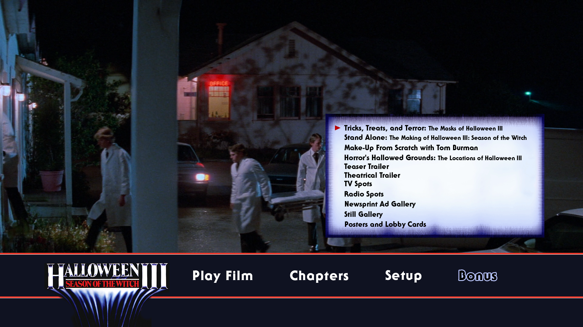 - “Stand Alone: The Making Of Halloween III: Season Of The Witch” Featuring Tommy Lee Wallace, Actors Tom Atkins And Stacey Nelkin, Stunt Coordinator Dick Warlock, Director Of Photography Dean Cundey, And More (unrestored HD; 33:09)