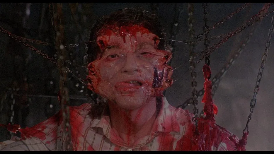 Arrow Video has decided to release their Scarlet Box (at least Hellraiser and Hellraiser II) in individual Blu-rays now that the Scarlet Box is out of print, collecting all of the same extras and transfers. Hellraiser gets a new 2k scan restoration that was approved by director of photography Robin Vidgeon. The new transfer looks quite good, with what I would consider medium-heavy grain. The grain tends to appear chunkier in darker contexts, but overall it’s not obstructive though some might take offense to its less clean look. Otherwise, definition is good as well as color balance and black levels and there are no real issues with the picture on this – even damage is minimal. A good quality scan from Arrow that showcases Hellraiser in all its moody glory.