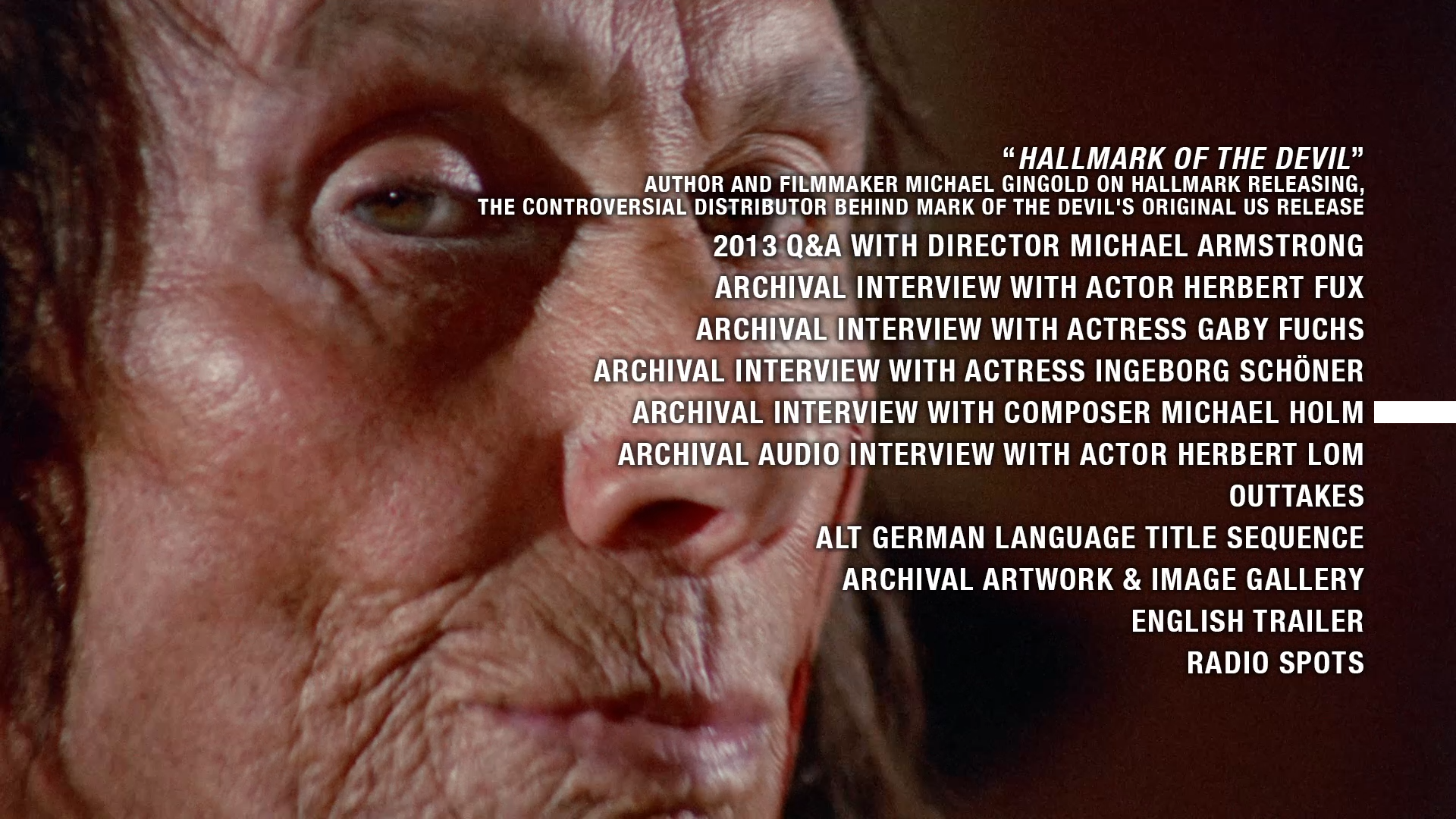 - “Hallmark of the Devil” – author and filmmaker Michael Gingold on Hallmark Releasing, the controversial distributor behind MARK OF THE DEVIL’s original U.S. release (1080p; 12:13)