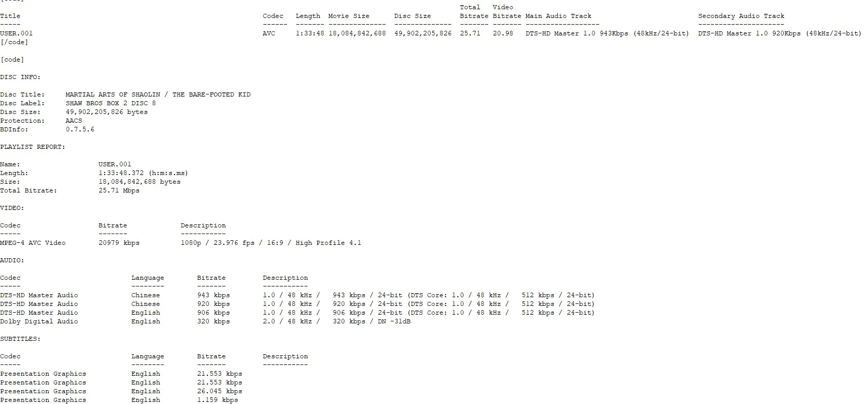 Martial Arts of Shaolin DTS 1.0 Cantonese Spek