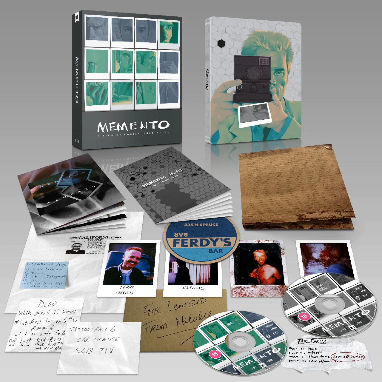 • Replica Polaroid art cards, printed notes and Ferdy’s beer mat enclosed in Leonard’s folder