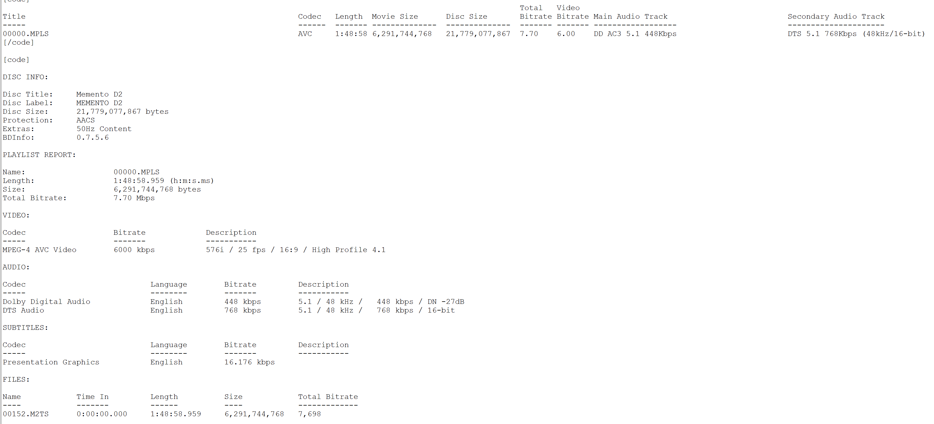 Memento Blu-ray Bitrate Info