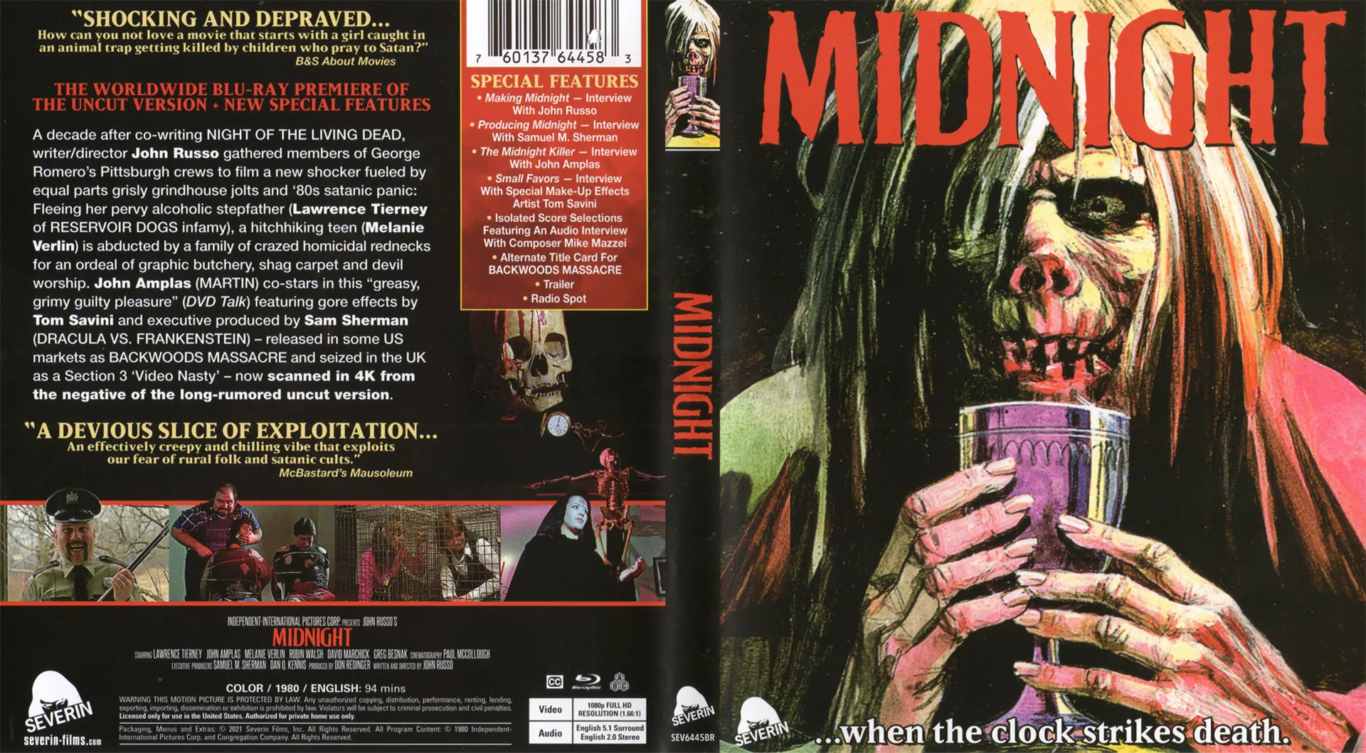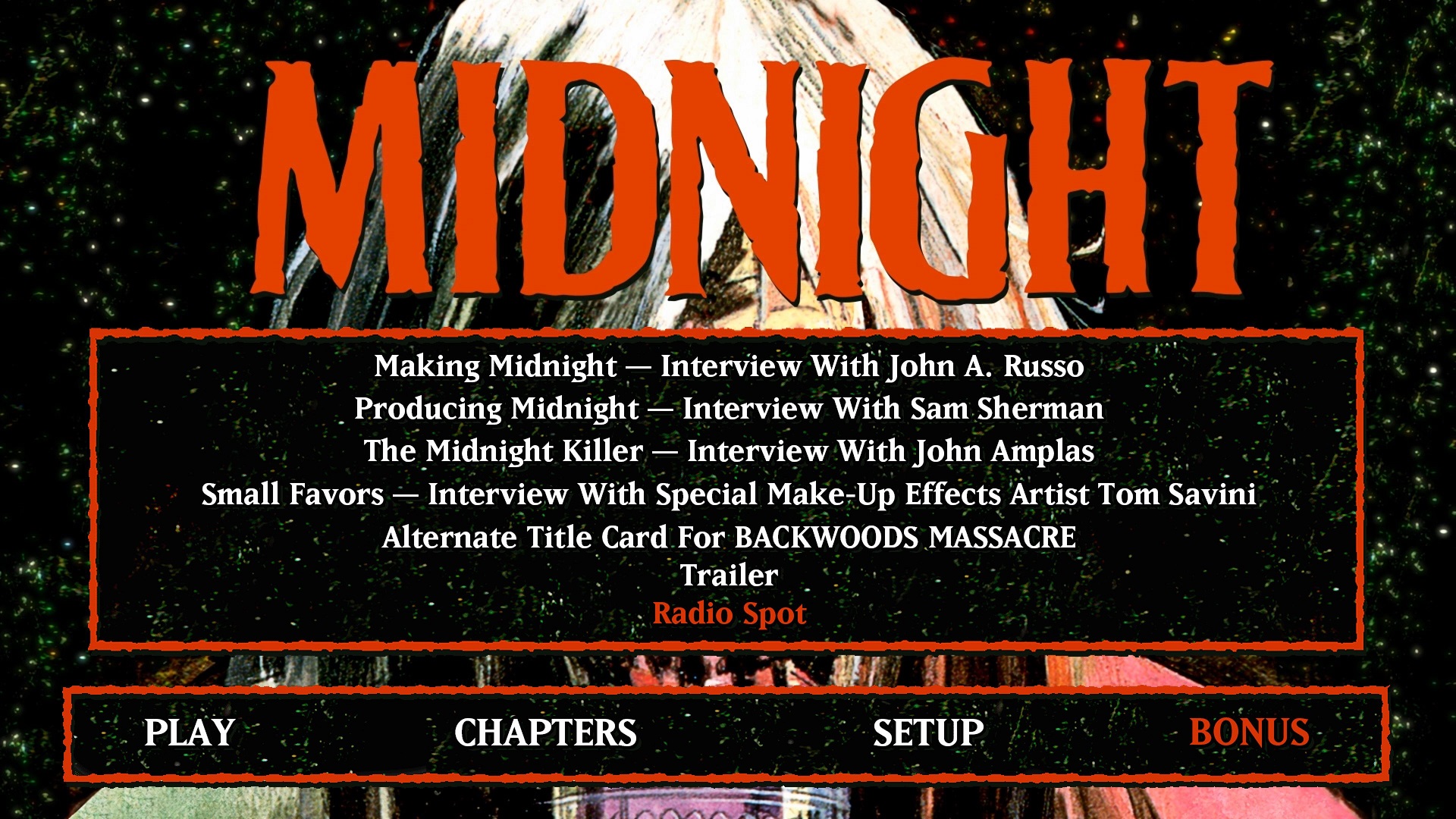 Making Midnight: Interview with Writer/Director John Russo Making Midnight: Interview with Writer/Director John Russo Producing Midnight: Interview with Producer Samuel M. Sherman Producing Midnight: Interview with Producer Samuel M. Sherman The Midnight Killer: Interview with Actor John Amplas The Midnight Killer: Interview with Actor John Amplas Small Favors: Interview with Special Make-Up Effects Artist Tom Savini Small Favors: Interview with Special Make-Up Effects Artist Tom Savini Alternate Title Card for BACKWOODS MASSACRE Trailer Radio Spot BD Info
