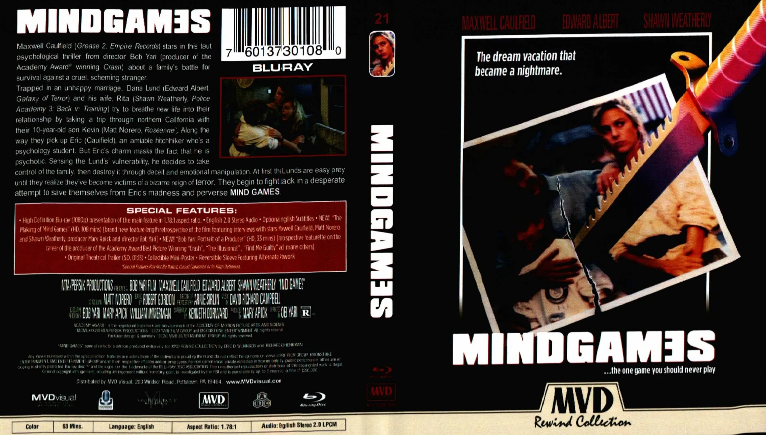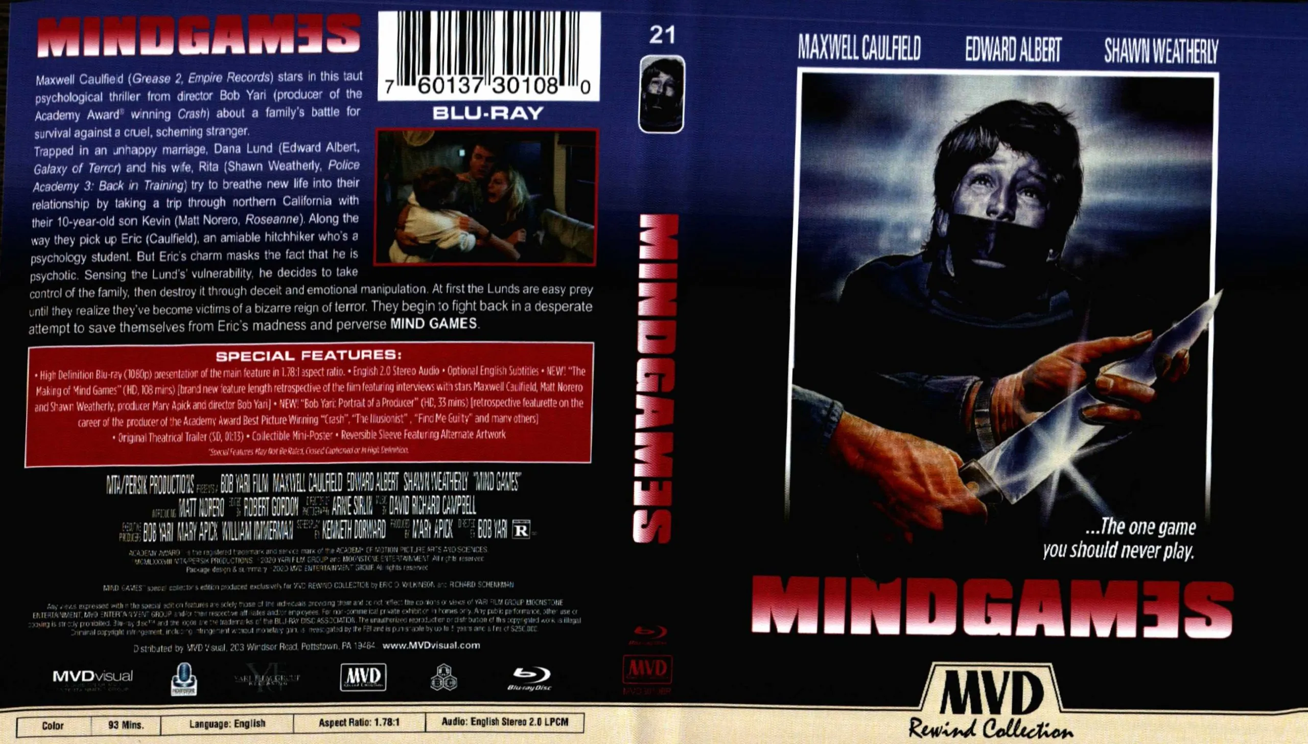 • NEW “The Making of Mind Games” brand new feature length retrospective of the film featuring interviews with stars Maxwell Caulfield, Matt Norero and Shawn Weatherly, producer Mary Apick and director Bob Yari (HD; 1:47:59)
