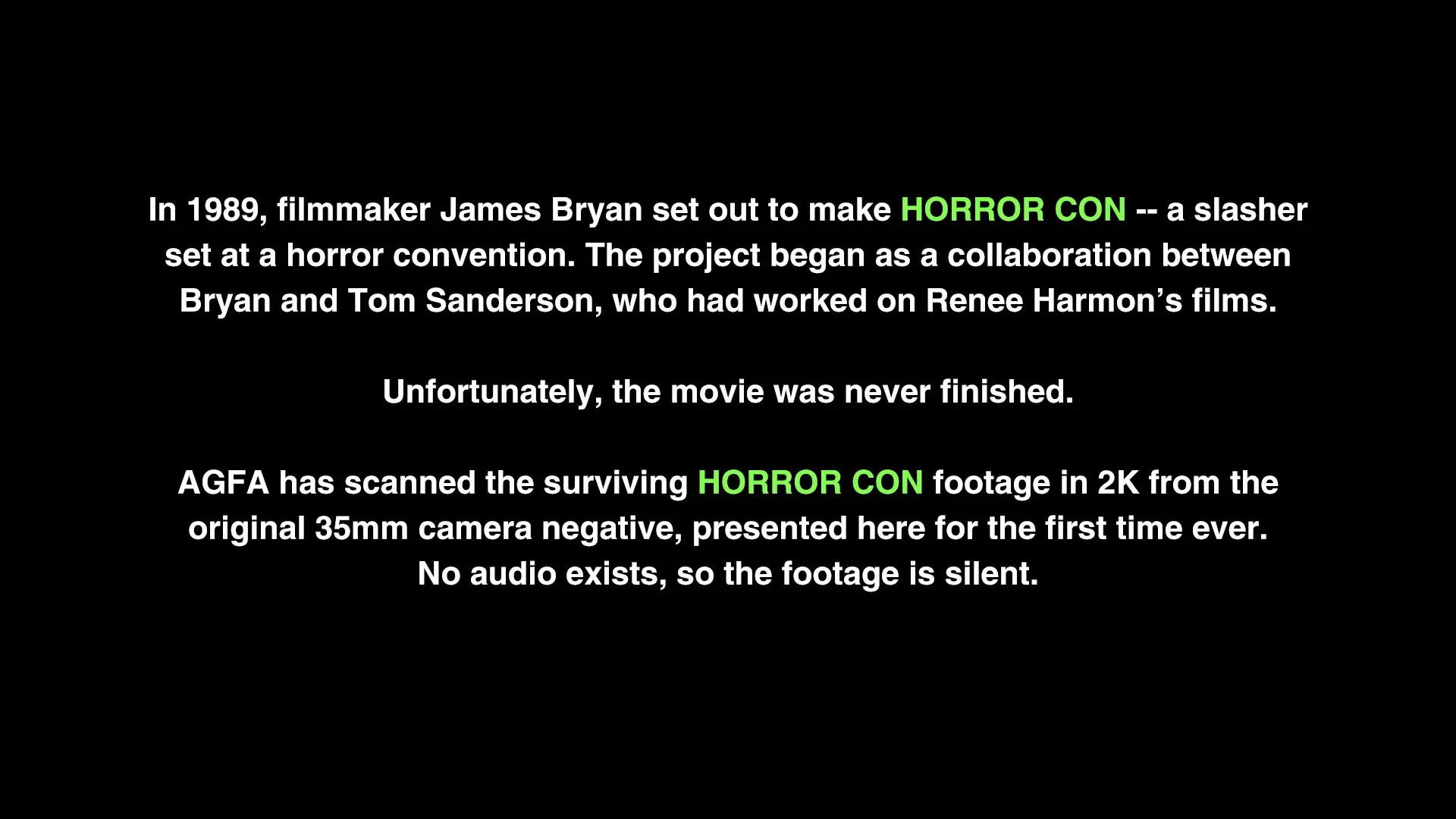 - HORROR CON (1989): surviving footage from James Bryan’s unfinished horror movie, scanned in 2K from the 35mm camera negative (1080p, 27:45)