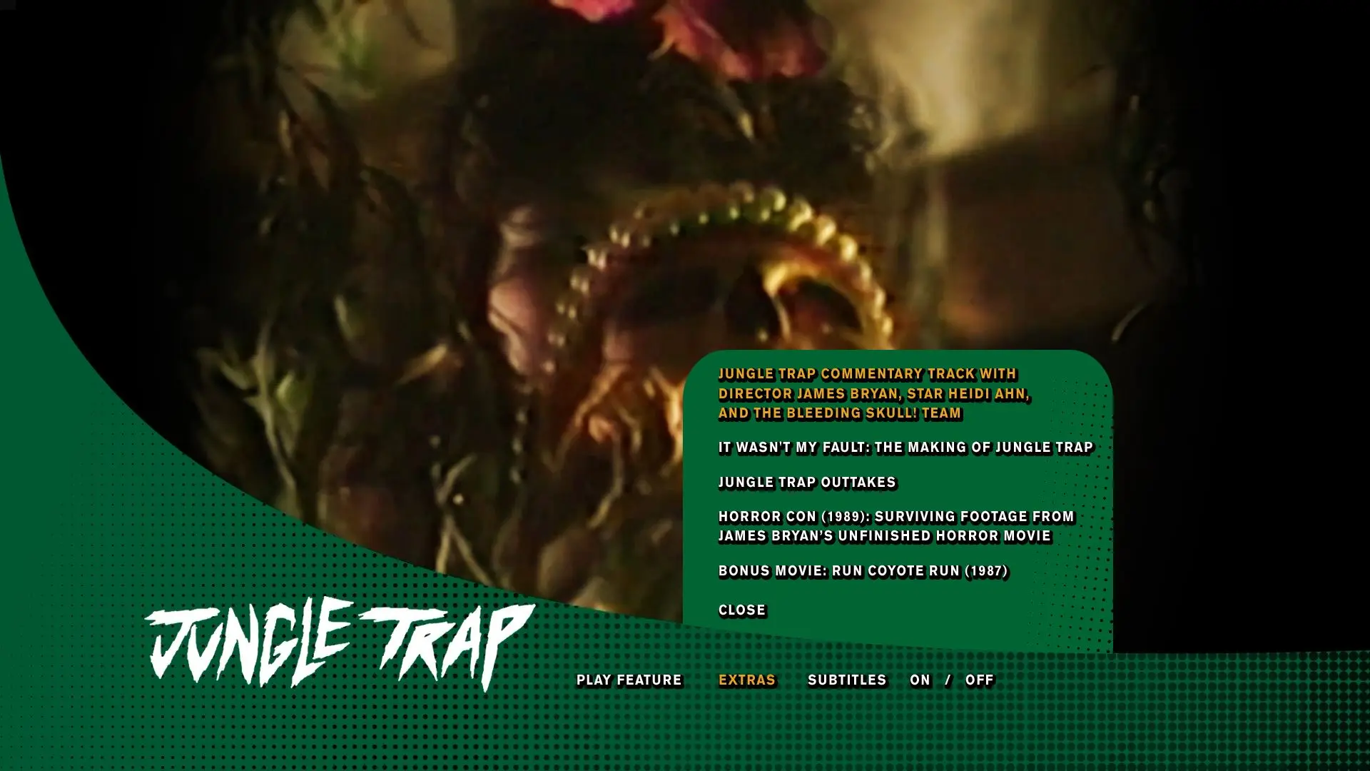- JUNGLE TRAP Commentary track with director James Bryan, star Heidi Ahn, and the Bleeding Skull! team