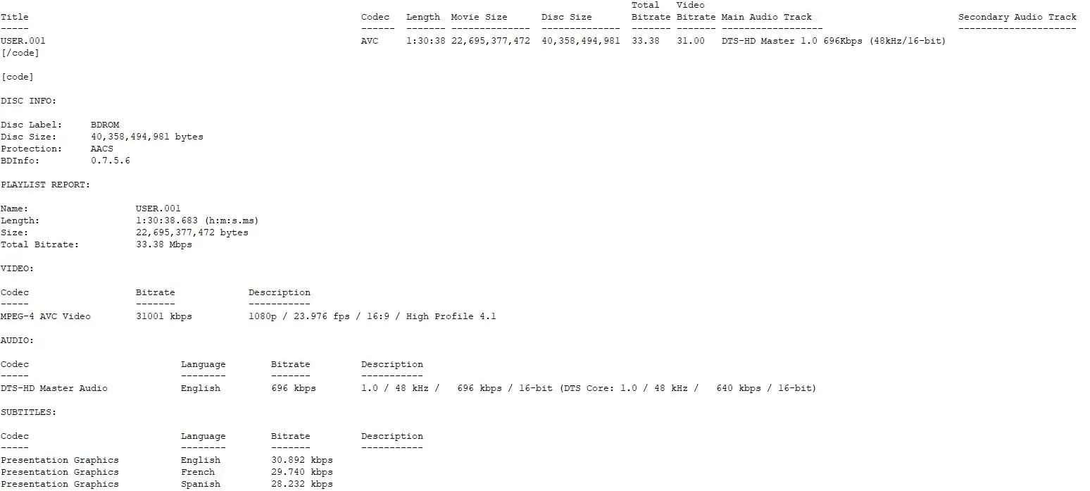 - Audio: 1.0 DTS-HD (English)