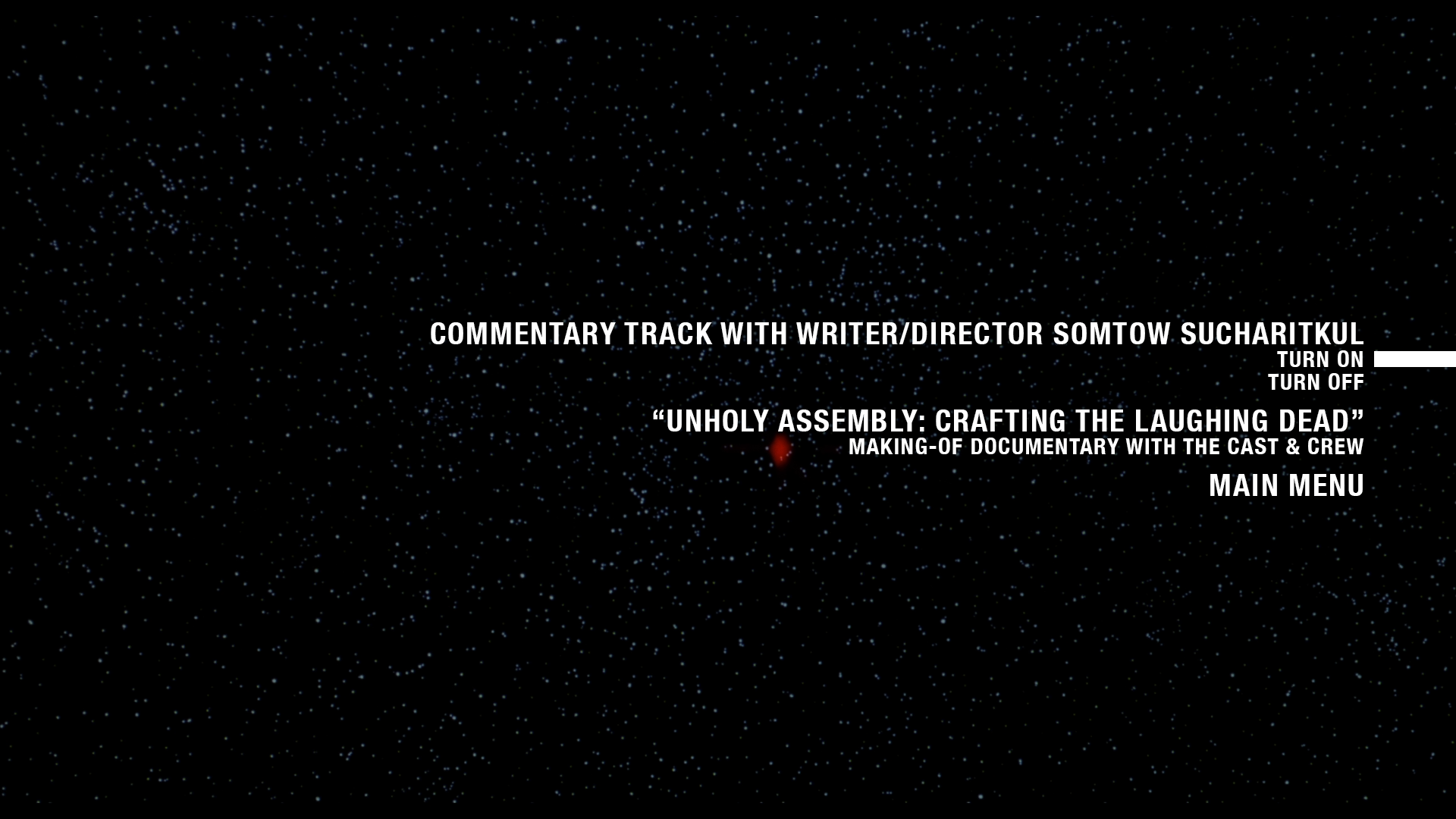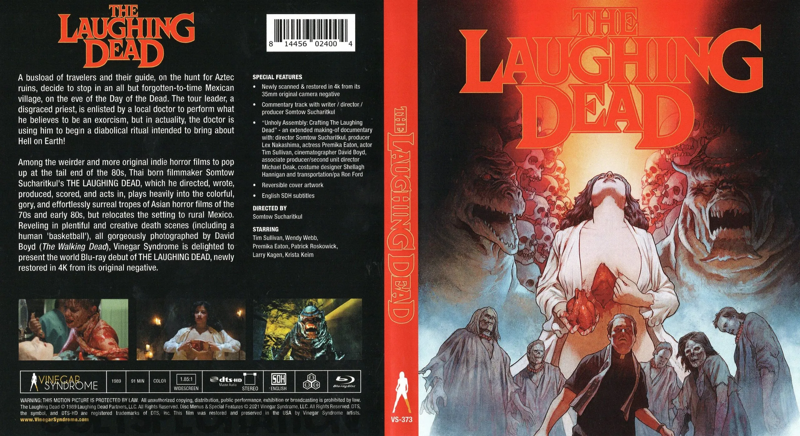 - NEW “Unholy Assembly: Crafting The Laughing Dead” – an extended making-of documentary with: director Somtow Sucharitkul, producer Lex Nakashima, actress Premika Eaton, actor Tim Sullivan, cinematographer David Boyd, associate producer/second unit director Michael Deak, costume designer Shellagh Hannigan and transportation/pa Ron Ford (HD; 35:12)