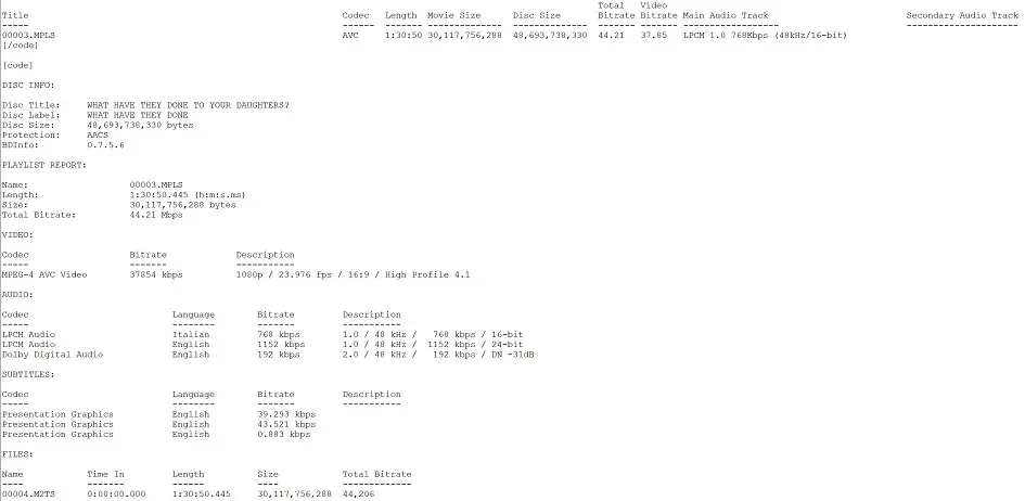 What Have They Done to Your Daughters? Blu-ray BD InfoWhat Have They Done to Your Daughters? Blu-ray Bitrate InfoWhat Have They Done to Your Daughters? Blu-ray Italian Spek InfoWhat Have They Done to Your Daughters? Blu-ray English Spek InfoWhat Have They Done to Your Daughters? Blu-ray Color Barcode