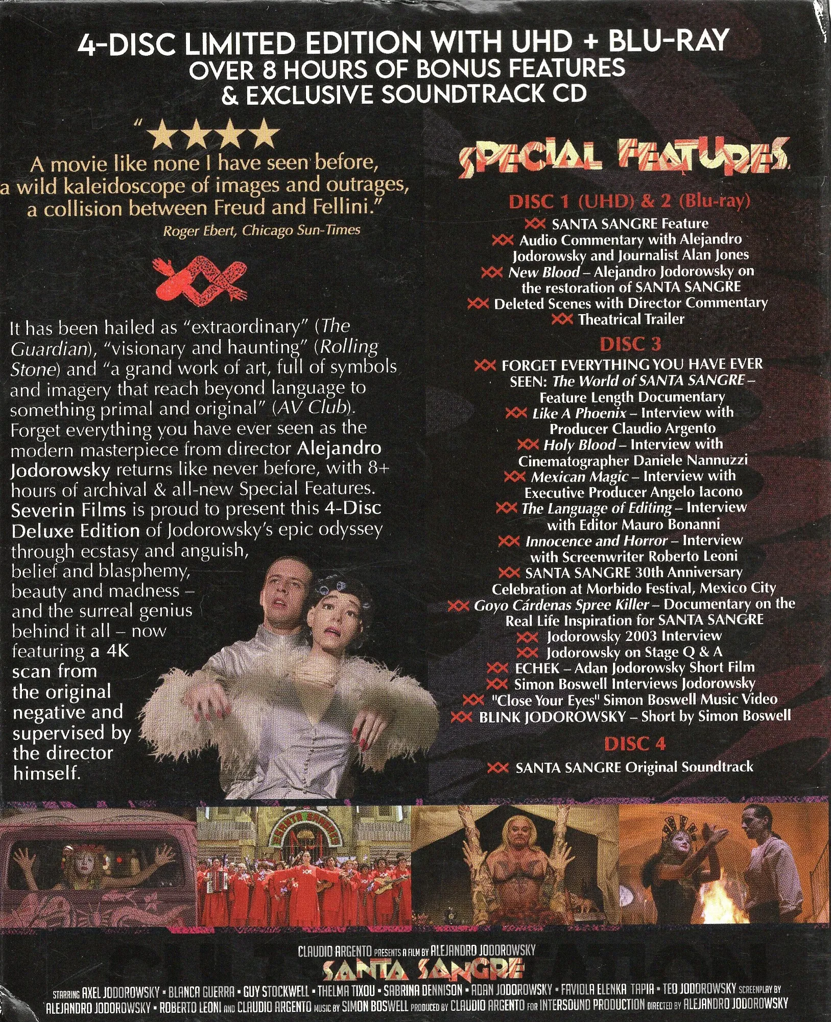 - NEW Forget Everything You Have Eover Seen: The World of Santa Sangre – 96 minute documentary Directed by David Gregory with Co-Writer / Director Alejandro Jodorowsky, Actors Axel Jodorowsky, Blanca Guerra, Thelma Tixou, Sabrina Dennison, Adan Jodorowsky, Elenka Tapia, Teo Tapia, Co-Writer Roberto Leoni, Composer Simon Boswell, Tattoo Designer Sergio Arau and Unit Publicist Greg Day (HD; 1:36:38)