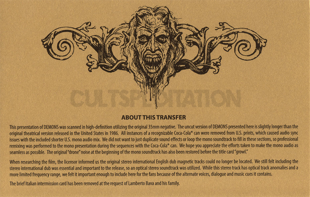 Here is a comparison gallery of screenshots from both Synapse Films’ Steelbook Blu-ray (left) and Synapse Films’ latest Limited Edition Blu-ray release (right) of Demons. You can right-click and view image in a new tab to do a comparison.