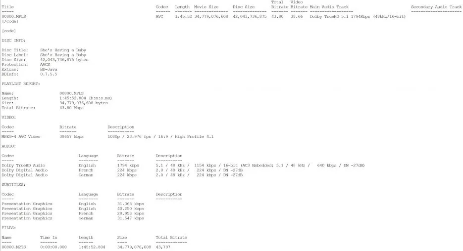 Click for a larger image and a slideshow. ScreencapsFeaturesMenusBD InfoShe’s Having a Baby BD InfoShe’s Having a Baby Bitrate InfoShe’s Having a Baby 5.1 Spek InfoShe’s Having a Baby Color Barcode Extra FeaturesFrom the Archives: Kevin Bacon Interviews John Hughes (HD, 24:10)Theatrical Trailer (SD, 2:14)Packaging DetailsJohn Hughes 5 Movie Collection SleeveShe’s Having a Baby DiscHosting screenshots is expensive. If you want to see more galleries, consider donating!