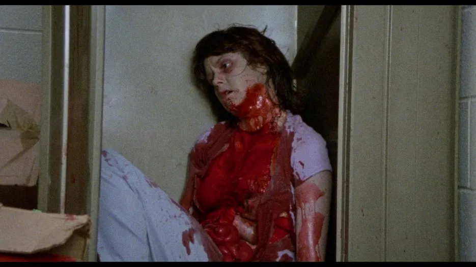 Vinegar Syndrome has given Splatter University a new Blu-ray release with a new scan of the 16mm camera negative. It’s important to note that Splatter University has most likely never looked great due to low budget and its 16mm quality, but Vinegar Syndrome has done quite a good job restoring the film for its new presentation. Clarity is excellent, color timing is consistent with a brightened and less yellowish hue compared to 88 Films’ prior Blu-ray release, and grain appears rather healthy despite a few extreme instances, most notably in the first few minutes of the film. Occasional debris and lines make their way into the film, including a couple serious scenes containing reel damage, but otherwise this seems like an improvement over past releases of the film.
