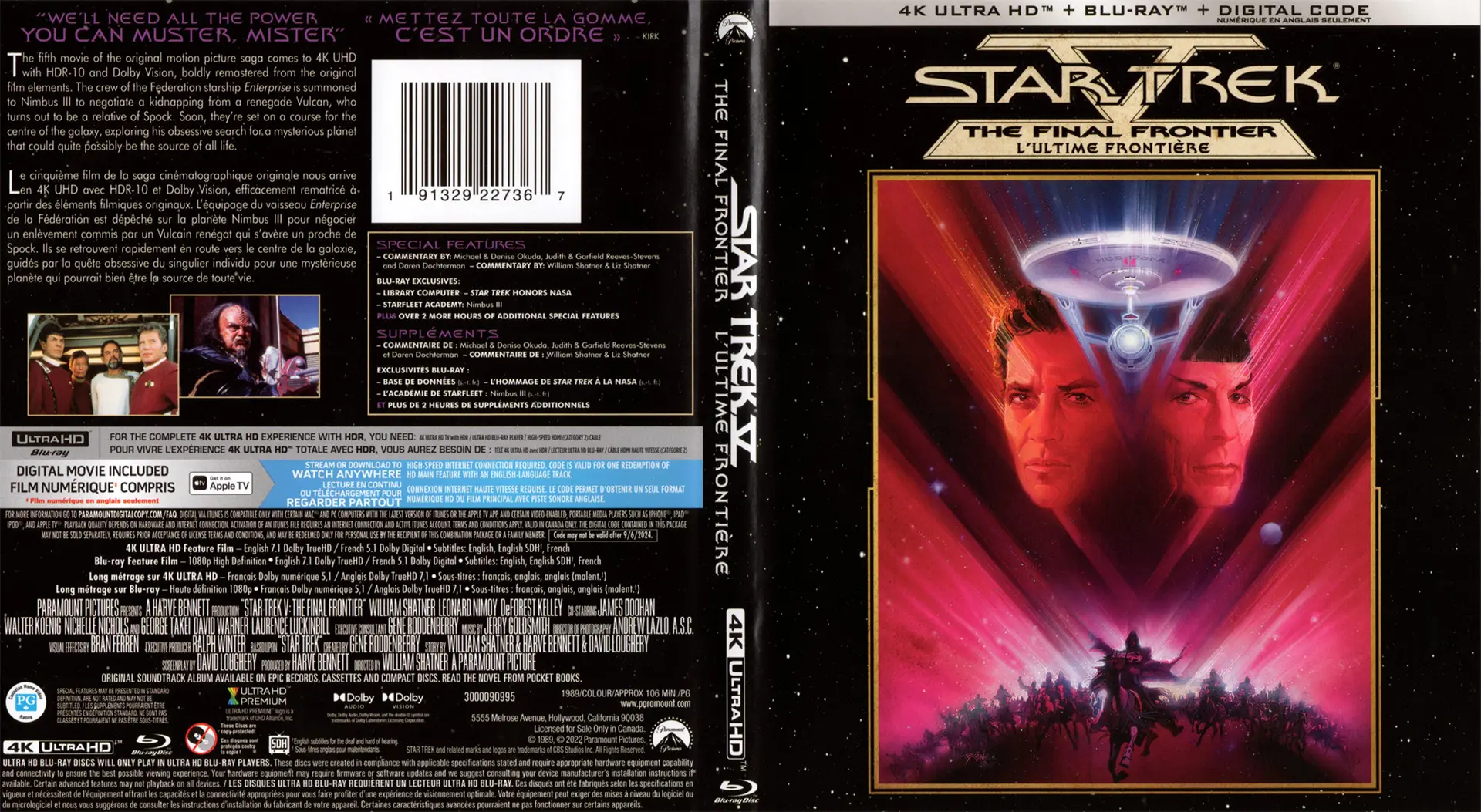 Audio Commentary by William Shatner and Liz Shatner Audio Commentary by Michael & Denise Okuda, Judith & Garfield Reeves-Stevens, and Daren Dochterman Library Computer ProductionHarve Bennett’s Pitch to Sales Team (480i, 1:42 ) The Journey: A Behind-The-Scenes Documentary (480i, 28:55 ) Makeup Tests (480i, 9:50 ) Pre-Visualization Models (480i, 1:41 ) Rockman in the Raw (480i, 5:37 ) Star Trek V Press Conference (480i, 13:42 ) The Star Trek UniverseHerman Zimmerman: A Tribute (480i, 19:09 ) Original Interview: William Shatner (480i, 14:37 ) Cosmic Thoughts (480i, 13:05 ) That Klingon Couple (480i, 13:05 ) A Green Future? (480i, 9:24 ) Star Trek Honors NASA (1080p, 9:57 ) Hollywood Walk of Fame: James Doohan (480i, 3:07 ) Starfleet Academy SCISEC Brief 005: Nimbus III (1080p, 3:02 ) Deleted ScenesMount Rushmore (480i, 00:18 ) Insults (480i, 2:03 ) Behold Paradise (480i, 00:52 ) Spock’s Pain (480i, 1:02 ) Production Gallery (480i, 4:04 ) The Gag Reel (480i, 1:08 ) StoryboardsSha Ka Ree The Face of God Escape Theatrical Trailer 1 (1080p, 2:42 ) Theatrical Trailer 2 (1080p, 1:34 ) TV SpotsVacation is over (480i, 0:32 ) Renegade (480i, 0:32 ) Challenge of Rebellion (480i, 0:32 ) Brothers (480i, 0:32 ) Beyond (480i, 0:32 ) Adventure (480i, 0:32 ) Warp speed now (480i, 0:32 ) Packaging Details Note: A slipcover featuring the same artwork below is also included.