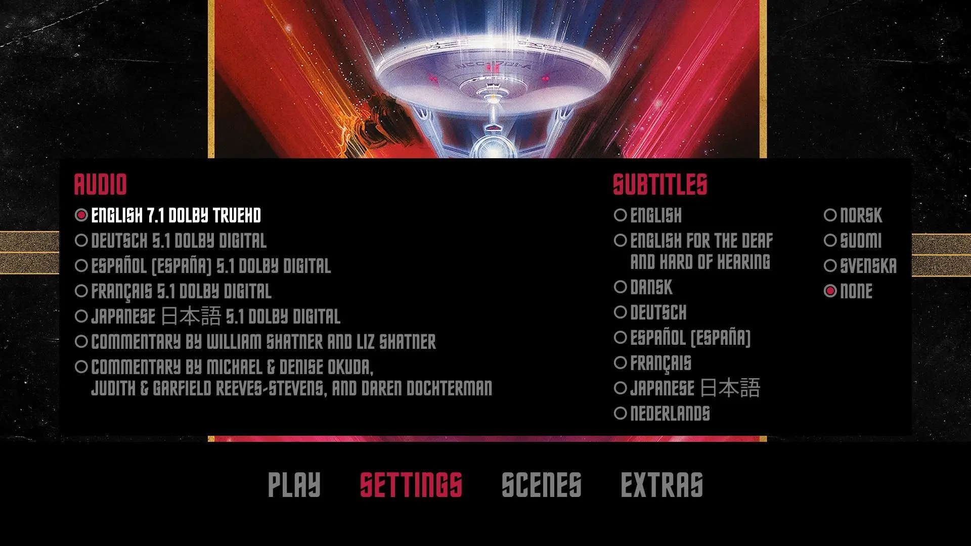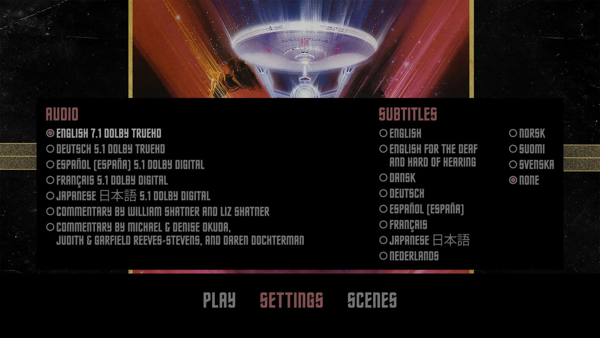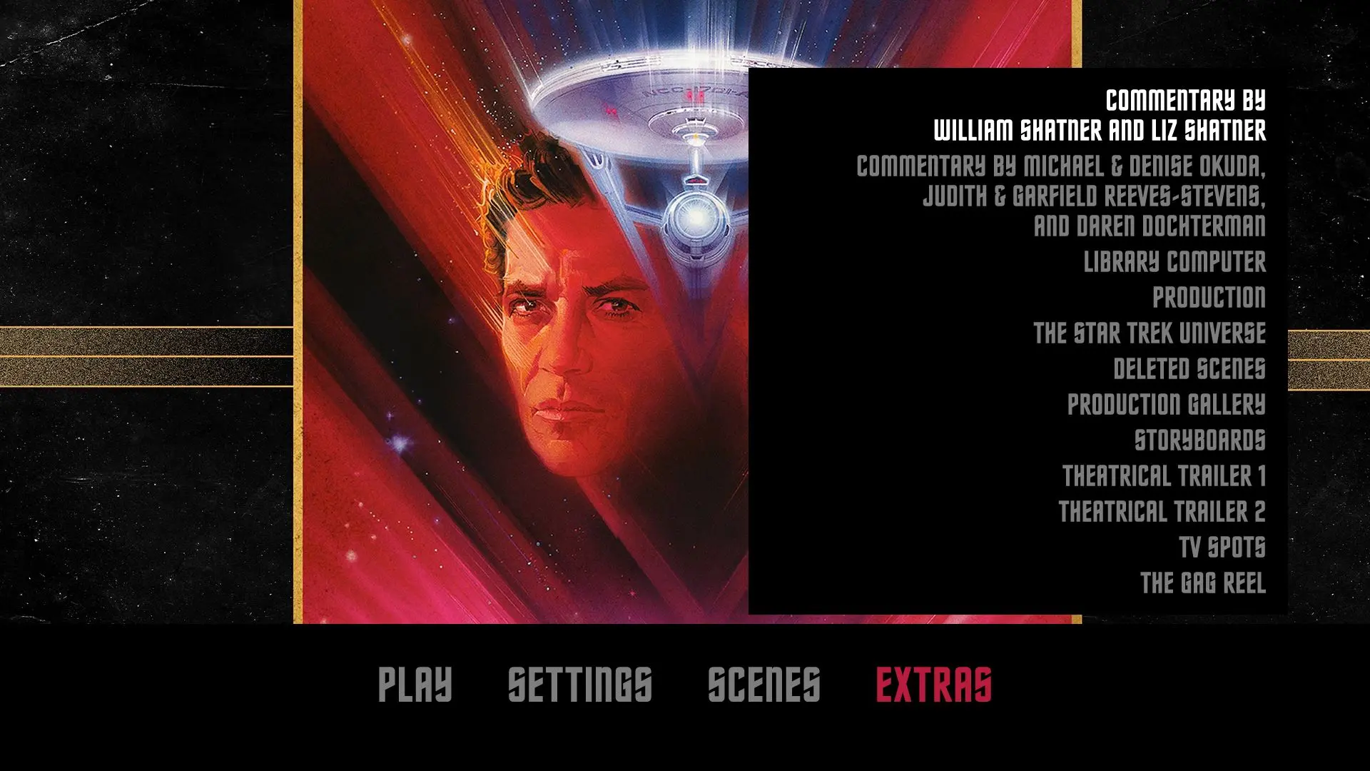 Audio Commentary by William Shatner and Liz Shatner Audio Commentary by Michael & Denise Okuda, Judith & Garfield Reeves-Stevens, and Daren Dochterman Blu-ray