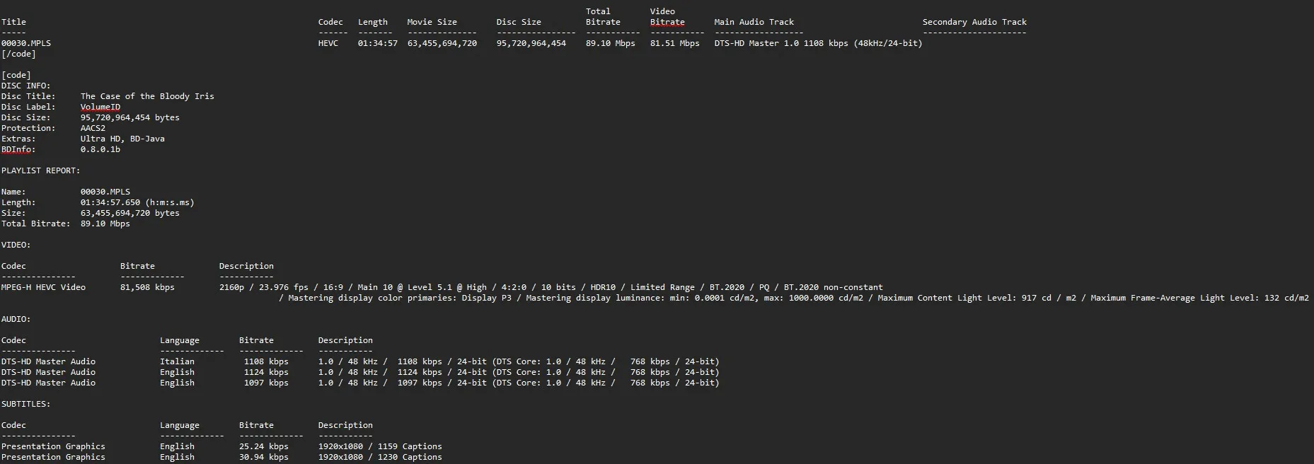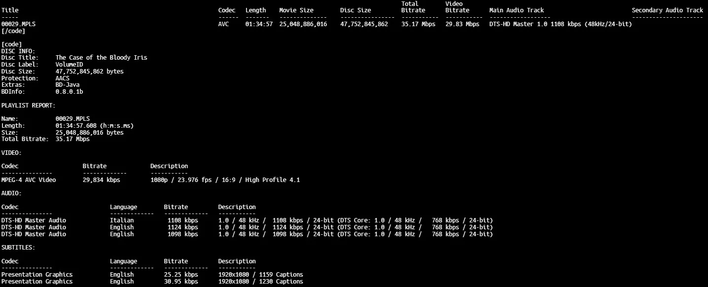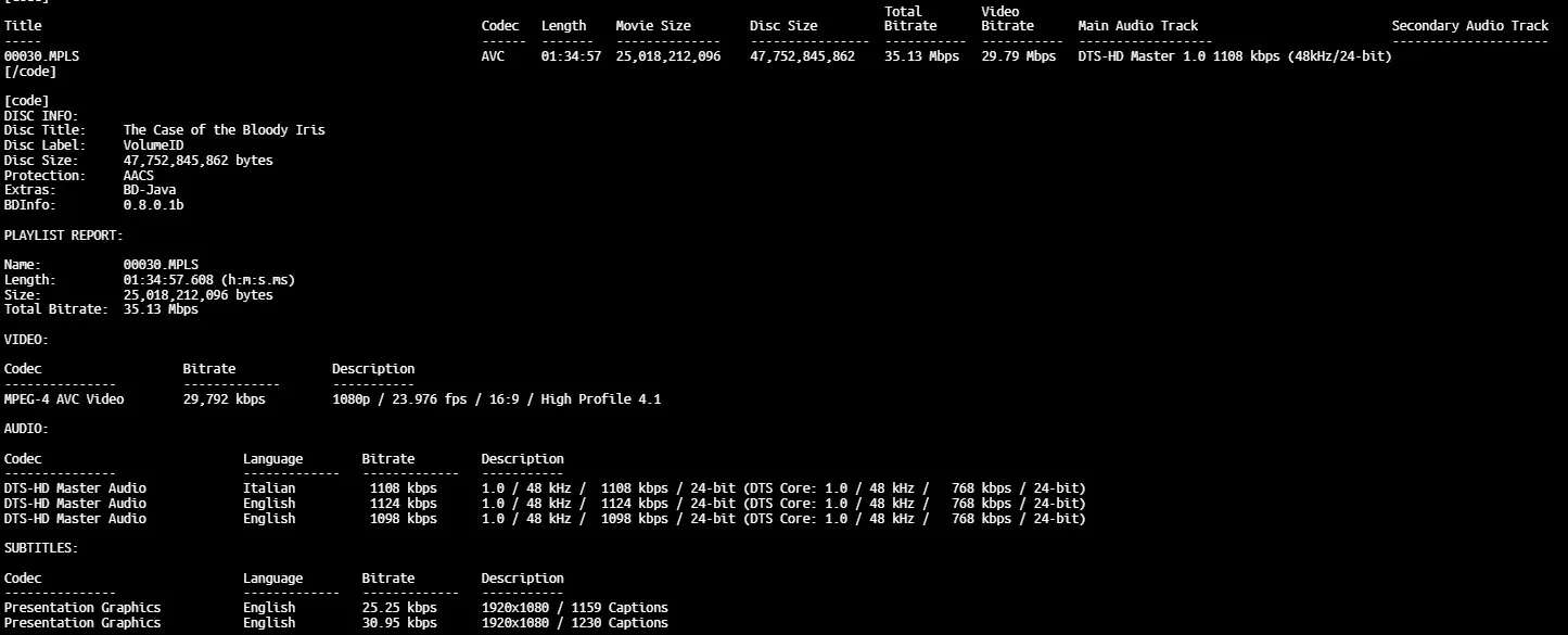 The Case of the Bloody Iris 4K Italian version BD info