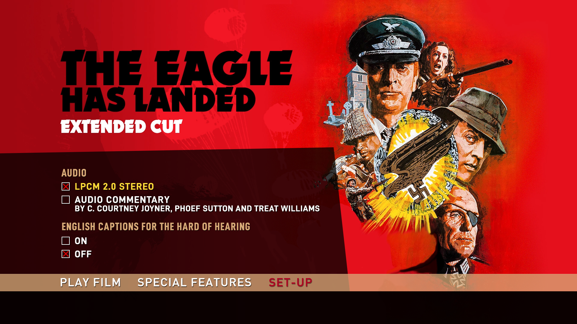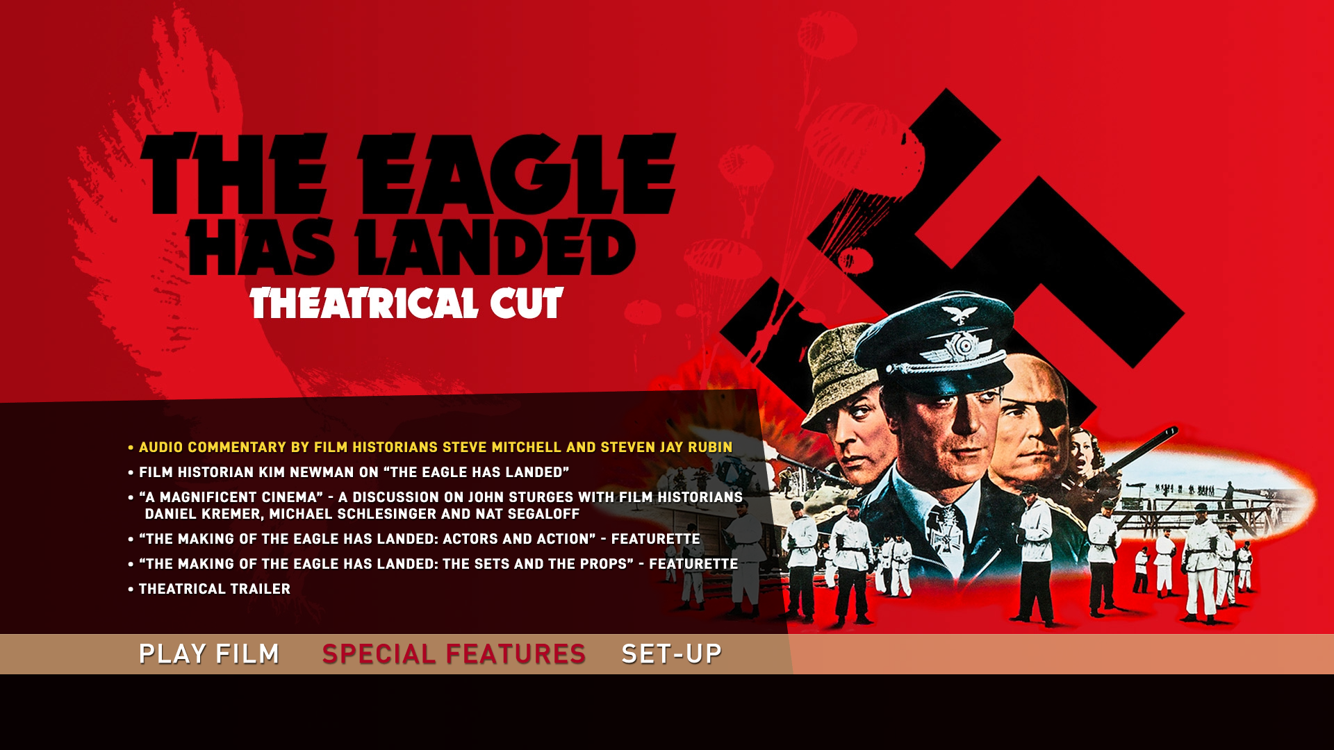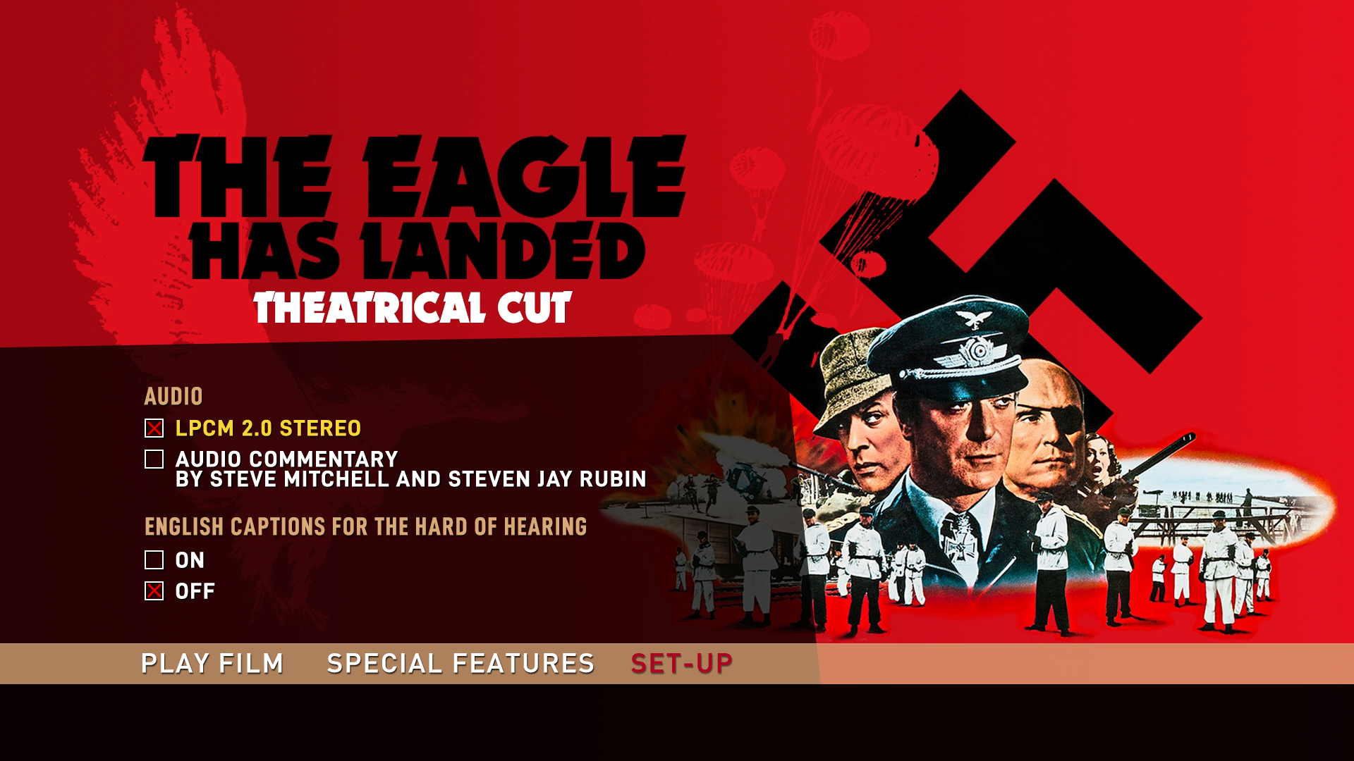 The Eagle Has Landed Blu-ray Hardcase Sleeve FrontThe Eagle Has Landed Blu-ray Hardcase Sheet BackThe Eagle Has Landed Blu-ray Hardcase FrontThe Eagle Has Landed Blu-ray Hardcase BackThe Eagle Has Landed Blu-ray Theatrical Cut Front SleeveThe Eagle Has Landed Blu-ray TC Reverse SleeveThe Eagle Has Landed Blu-ray Extended Cut Front SleeveThe Eagle Has Landed Blu-ray EC Reverse SleeveThe Eagle Has Landed Blu-ray TC DiscThe Eagle Has Landed Blu-ray EC Disc