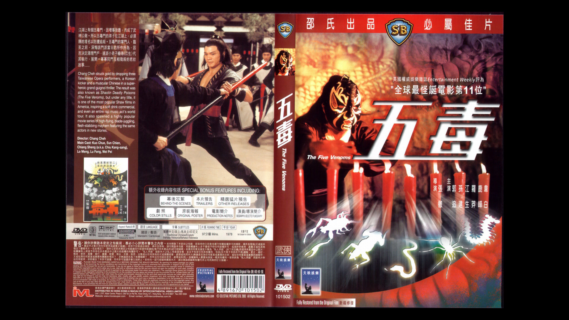 Uncompressed Mandarin and English original mono audio, plus Cantonese mono for The Five Venoms
