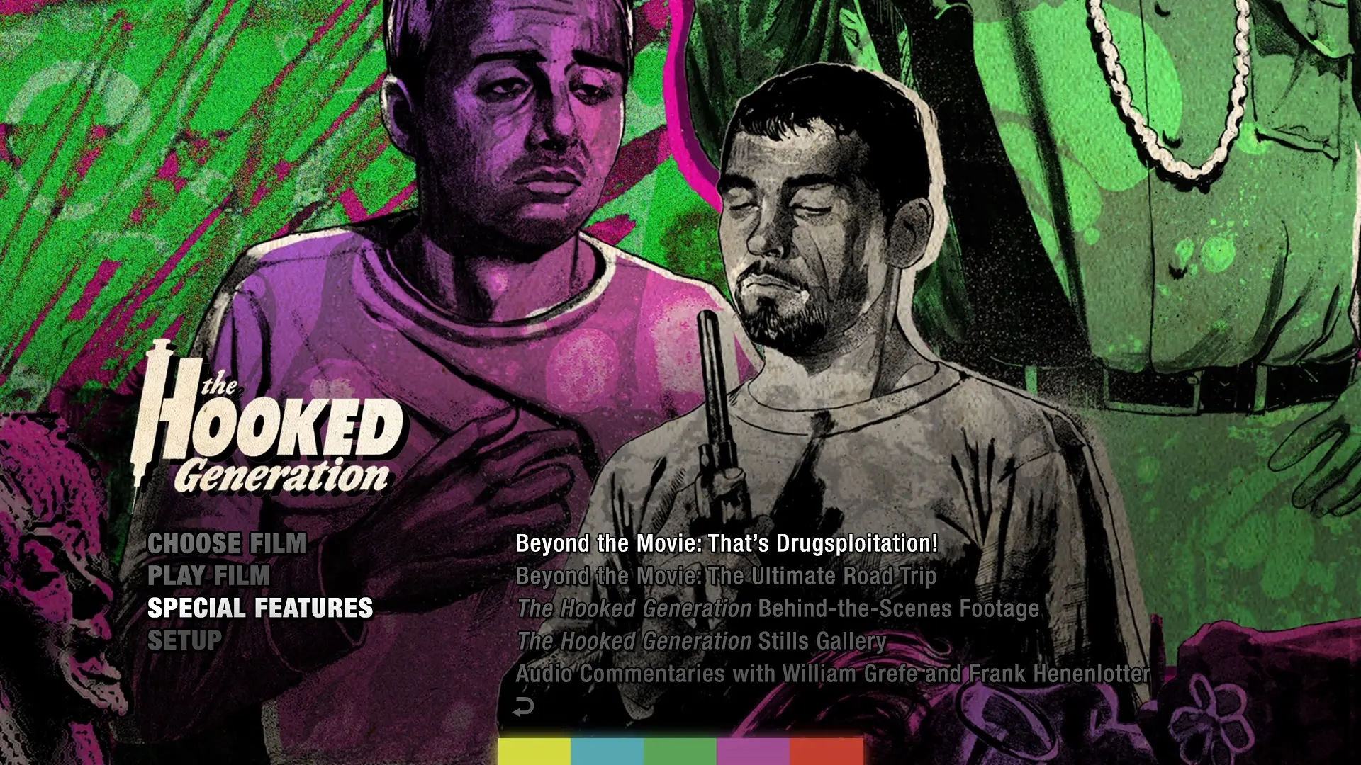 - Beyond the Movie: That’s Drugsploitation! – a look inside the counter culture films that inspired The Hooked Generation with author/film historian Chris Poggiali (HD, 7:50)