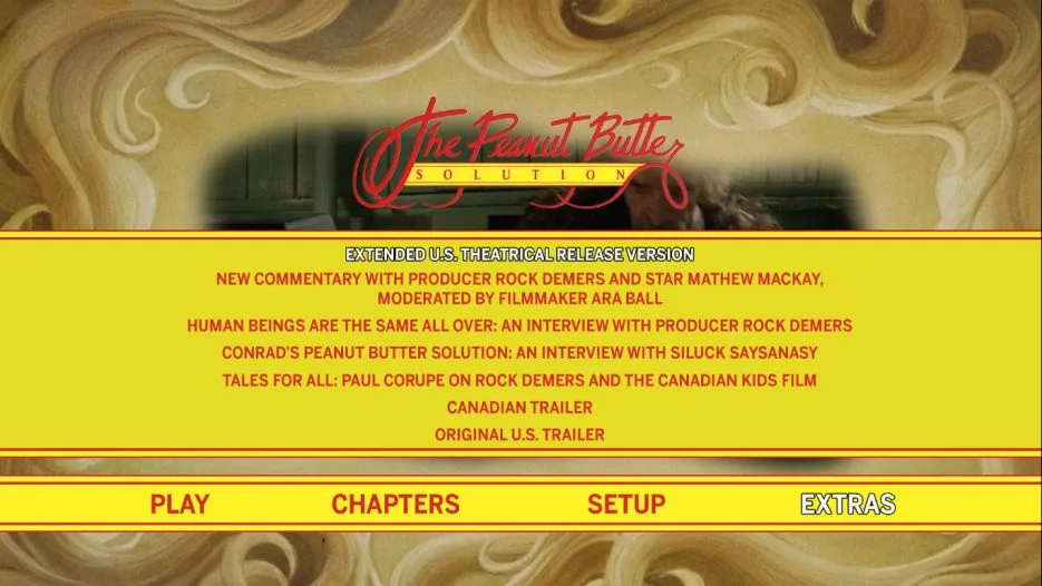 Special Features include a new audio commentary with Producer Rock Demers and Actor Matthew MacKay, Moderated by Filmmaker Ara Ball. There is a new interview with producer Rock Demers, who talks not only about The Peanut Butter Solution, but some of the other films in the Tales for All series of Canadian kids movies. The Dog Who Stopped The War needs to be released ASAP! The second new interview is with actor Siluck Saysanasy, who reminisces about his audition, working with director Michael Rubbo, and having a great time just being a kid on set. The last new interview is with writer Paul Corupe, who talks even more about the Tales for All series. Rounding the features out are two trailers for the movie.