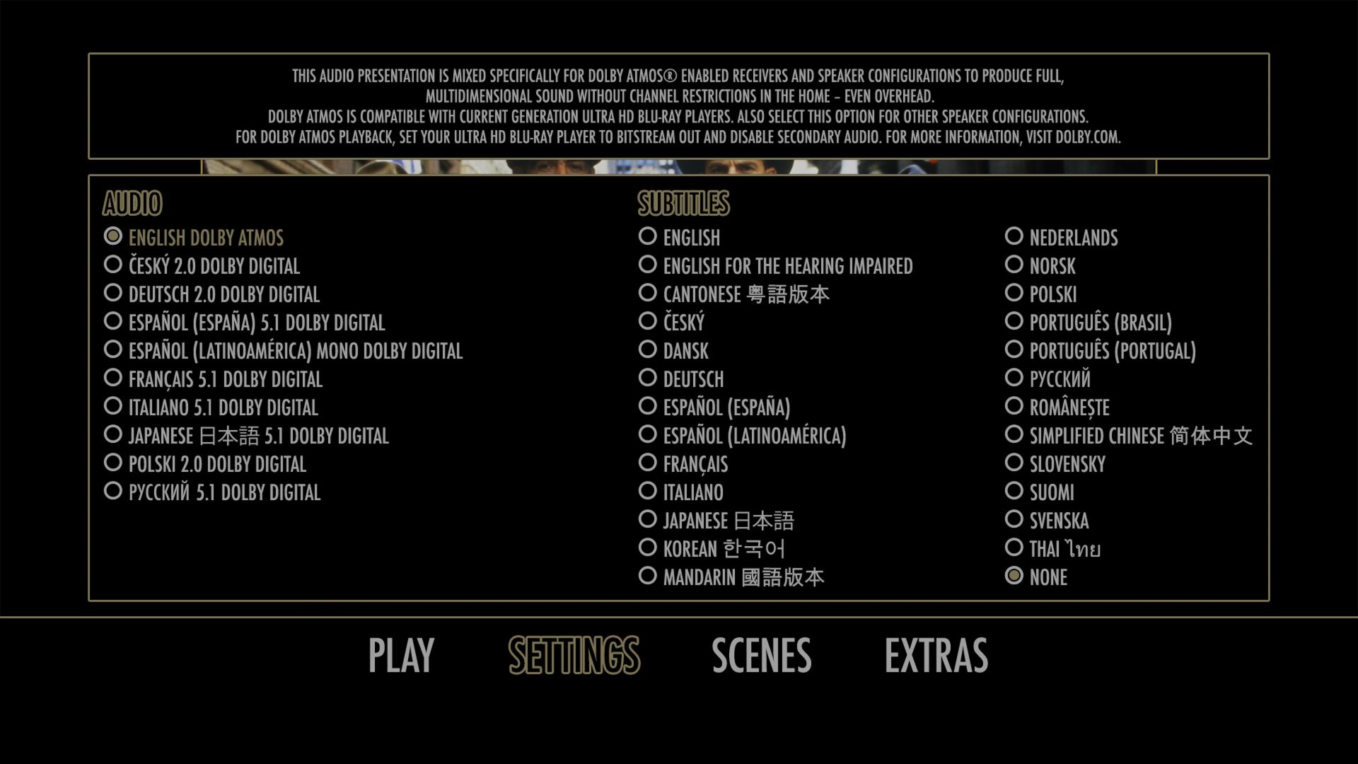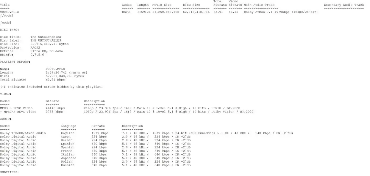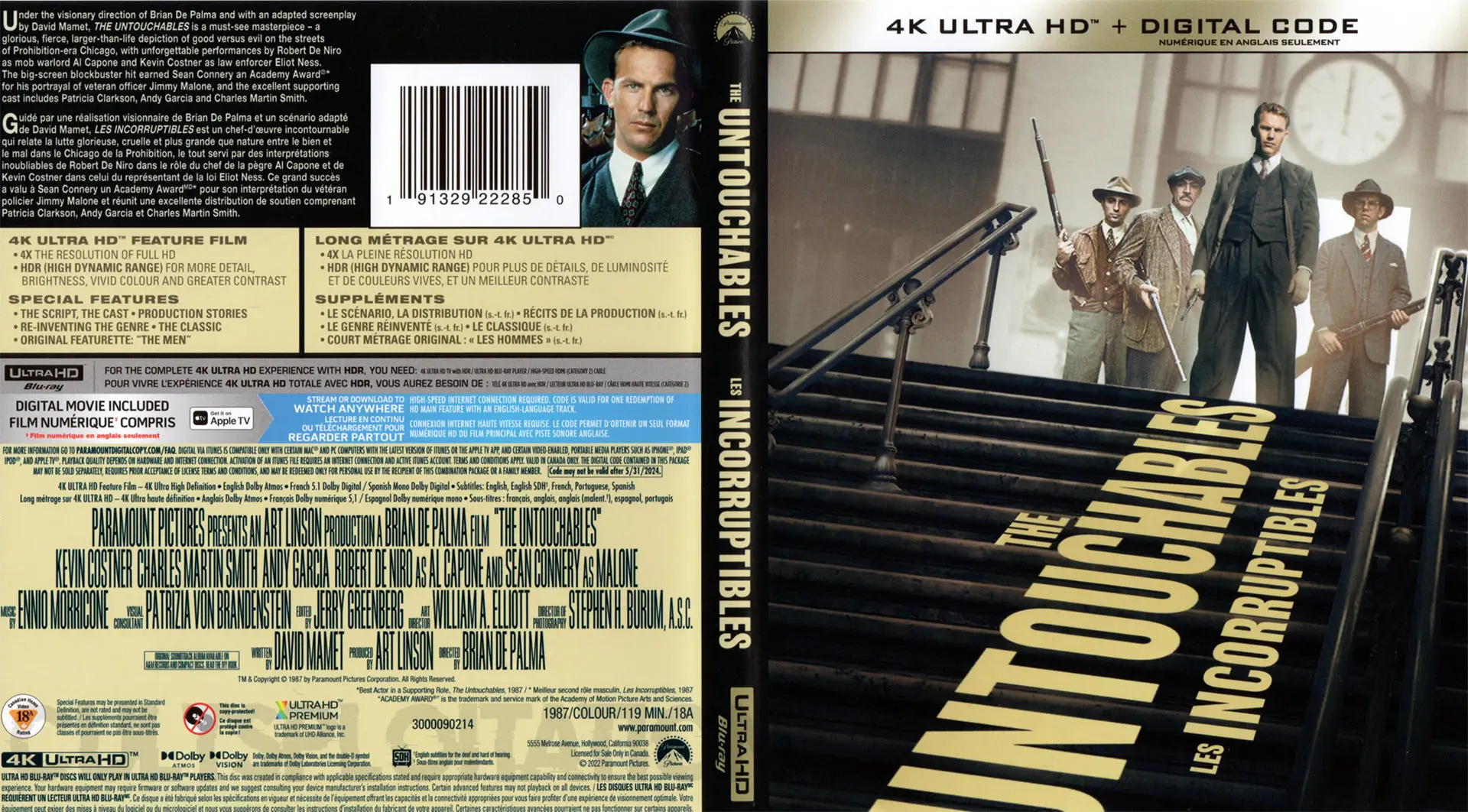 Right-click and open image in a new tab for full-size images. Note: due to color inconsistencies in the HDR->SDR conversion, these images are presented without HDR. Screencaps The Untouchables UHD screencap 1 The Untouchables UHD screencap 2 The Untouchables UHD screencap 3 The Untouchables UHD screencap 4 The Untouchables UHD screencap 5 The Untouchables UHD screencap 6 Menus The Untouchables UHD Menu The Untouchables UHD Settings Menu The Untouchables UHD Scenes Menu The Untouchables UHD Extras Menu Features The Script, The Cast The Script, The Cast The Script, The Cast The Script, The Cast Production Stories Production Stories Production Stories Re-inventing the Genre Re-inventing the Genre The Classic The Classic Original Featurette: “The Men” Original Featurette: “The Men” Theatrical Trailer The Untouchables UHD BD Info The Untouchables UHD Bitrate Info The Untouchables UHD Spek Info Extra Features The Script, The Cast (1080p, 18:31 ) Production Stories (1080p, 17:18 ) Re-inventing the Genre (1080p, 14:24 ) The Classic (1080p, 5:39 ) Original Featurette: “The Men” (1080p, 5:26 ) Theatrical Trailer (1080p, 2:49 ) Packaging Details Note: A slipcover featuring the same artwork below is also included.