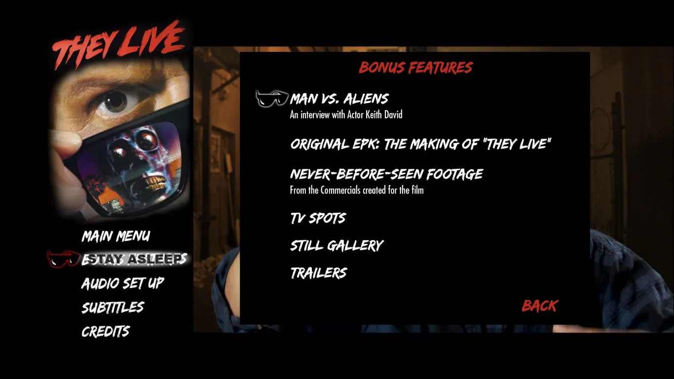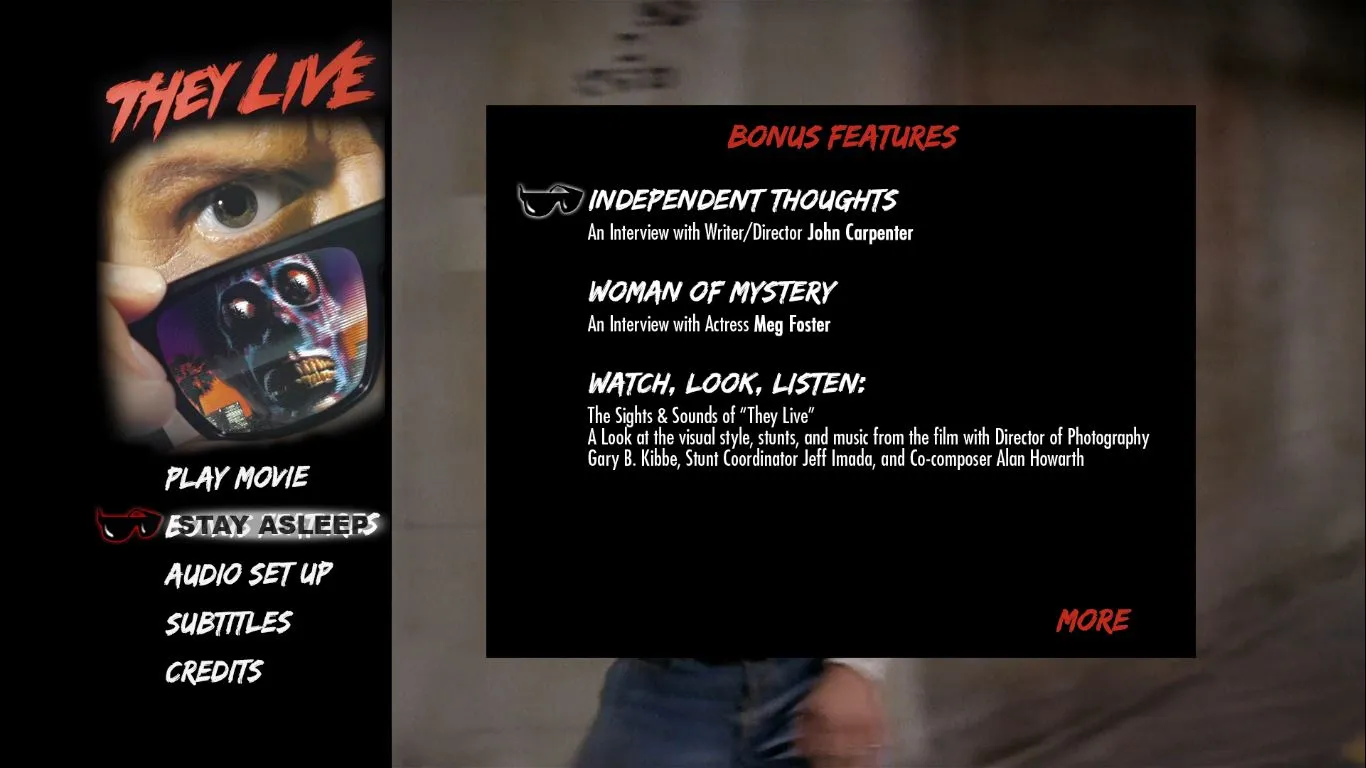 - “Watch, Look, Listen: The Sights & Sounds Of They Live” – A Look At The Visual Style, Stunts And Music With Director Of Photography Gary B. Kibbe, Stunt Coordinator Jeff Imada, And Co-Composer Alan Howarth (HD; 11:14)