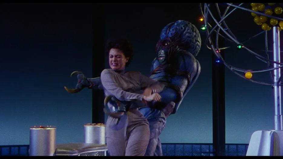 Cal, Ruth, and disposable scientist Steve Carlson (Russell John) start to suspect something isn’t right about this setup. (It’s possible the alien-looking foreheads and stark white hair of Exeter and his assistants was the giveaway.) They look to escaping, but Exeter and his bosses have other plans and bring Cal and Ruth up into space and back to their home planet of Metalunan. A galactic war has been going on for quite some time and Exeter’s homeworld is about to die unless they can find a way to turn iron into uranium. Cue one random blue smurf scene and MU-TANT later, and the audience is treated to a weak plot, but an entertaining conclusion.